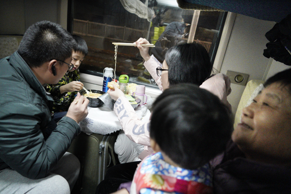 山東能源職工張磊一家人回家過年,在火車上吃晚飯--泡面和火腿腸(銀質收藏)山東能源集團  袁宏  攝