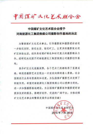 7月28日中國煤礦文聯焦煤集團攝影創作基地在河南能源化工集團焦煤公司授牌,這是繼2013年4月28日,中國煤礦文聯攝影家協會在安徽淮北礦業集團建立第一個煤礦攝影創作基地以來的又一個煤礦攝影創作基地。