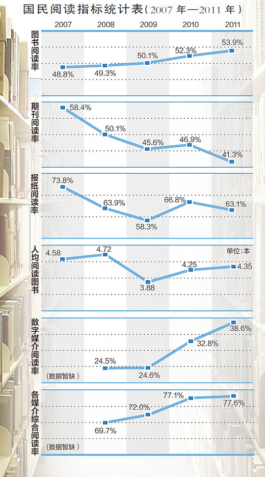 調查顯示,2011年我國國民包括書報刊和數字出版物在內的各種媒介的綜合閱讀率為77.6%,比2010年增加0.5個百分點。其中,圖書閱讀率為53.9%,較上年增加了1.6個百分點,連續第四年增長;報紙閱讀率為63.1%、期刊閱讀率為41.3%,分別較上年下降3.7和5.6個百分點。