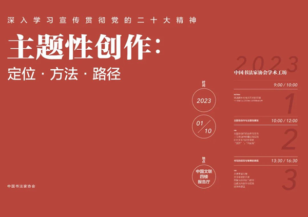 為學習宣傳貫徹黨的二十大精神,總結年度主題創作和學術研究成果,推動書法事業繁榮發展,1月10日,中國書協“主題性創作:定位·方法·路徑”學術工坊在北京中國文藝家之家舉辦。學術工坊以主題發言、交流互動、學術評議的方式,對“主題性創作與主題性展覽”“書寫的規范與筆墨的表現”兩大核心話題的九個議題,展開討論。