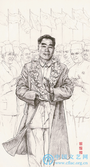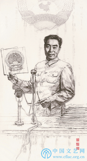 對于三位畫家而言,“丹心譜”三個字重逾千斤,從中可以感受到周恩來總理為國為民的一片丹心,和無私奉獻、鞠躬盡瘁,為中國人民謀幸福、為中華民族謀復興的崇高風范和偉大精神。畫家們年少時學到的周恩來總理“為中華之崛起而讀書”的志向,讓“做一個有理想、有道德的人”的信念從小就深深植入了心靈,給了他們不畏艱辛、追求夢想的勇氣和鼓勵,而中央美術學院嚴謹的學院派教學理念、老師們的言傳身教、國際藝術視野的開闊等,在讓他們奠定扎實深厚的基本功之上,升華了對藝術創作的理解和追求。 “我們畫總理、學總理,就是要表現周總理上下求索、英勇奮斗的人生足跡,帶著懷念、帶著思索、帶著堅守,來感受、觸摸總理的堅毅與溫情。”李世剛說。