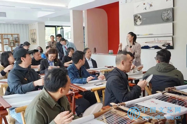 詞曲作家在鎮湖蘇繡藝術家吳昊僖指導下進行刺繡體驗