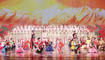 本報訊 作為2023年中國文聯文化潤疆主題展演活動的重要內容,“新歌唱新疆”——優秀原創歌曲演唱會巡演活動繼在烏魯木齊的首場演出后,于6月9日、10日先后走進兵團八師石河子市、伊犁哈薩克自治州伊寧市,開展了豐富多彩的演出活動,熱情謳歌在黨的領導下新疆各族人民的美好生活和奮進新征程、建設美好新疆的精神風貌。圖為在伊寧的演出中,由伊犁師范大學和合天山合唱團表演的混聲合唱《中華民族一家親》。