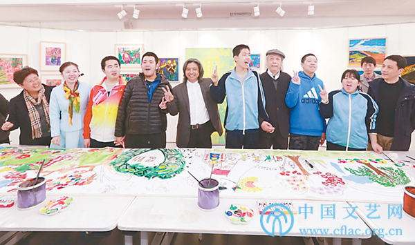 2017年3月31日,“來自中國美術館的溫度——關愛自閉癥人群公益沙龍活動”在中國美術館舉辦。圖為吳為山與自閉癥孩子們共同創作繪畫作品《春天》。