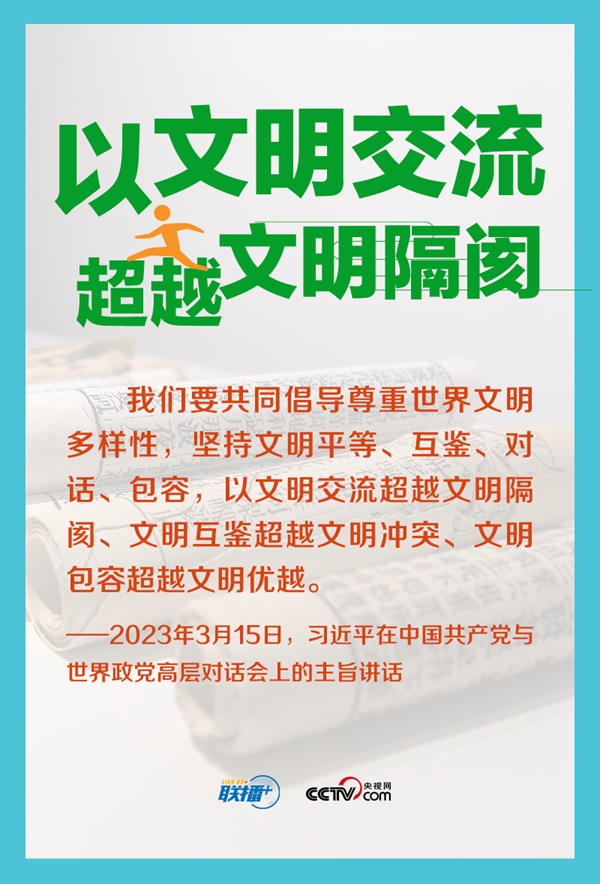 聯播+ 文明因交流而多彩,文明因互鑒而豐富。今年3月,在中國共產黨與世界政黨高層對話會上,習近平主席首次提出全球文明倡議,主張“共同倡導尊重世界文明多樣性”,為推動文明交流互鑒、促進人類文明進步提供中國方案。