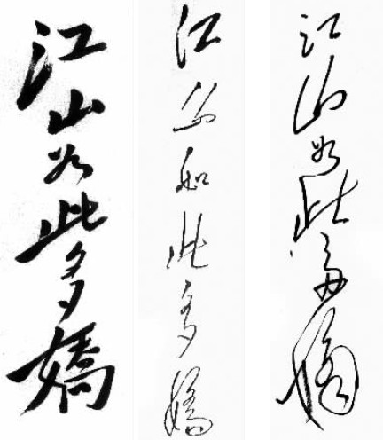 1959年,為慶祝中華人民共和國(guó)成立十周年,中央請(qǐng)傅抱石、關(guān)山月為北京人民大會(huì)堂繪制巨幅國(guó)畫《江山如此多嬌》,這畫題的六字就是取自毛的這首詞中,而且,是毛親自為此畫題的字。上世紀(jì)60年代前半期,毛還數(shù)次書寫過(guò)這首詞。下面,我們把40年代為柳亞子書詞中的這六字、題畫上的這六字(原橫排改為豎排)、60年代書詞中的這六字并列在一起,相信許多朋友會(huì)感興趣:52歲的毛,66歲的毛以及70歲上下的毛,其書法藝術(shù)呈現(xiàn)出哪些變化呢?
