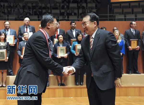 12月12日,第六屆孔子學院大會開幕式在北京國家大劇院舉行。中共中央政治局常委李長春出席開幕式,并為全球孔子學院先進個人和突出貢獻獎獲獎者頒獎,觀看外國歌唱家我唱北京音樂會。這是音樂會結束后,李長春走上舞臺,與演員親切握手。
