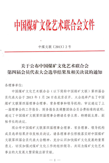關于公布中國煤礦文聯第四屆會員代表大會選舉結果及相關決議的通知 來源:中國煤礦文化網 作者: 時間:2014-03-06 【字體:小 大】 附件:中國煤礦文聯第四屆會員代表大會選舉結果及相關決議 分享到: 【打印正文】