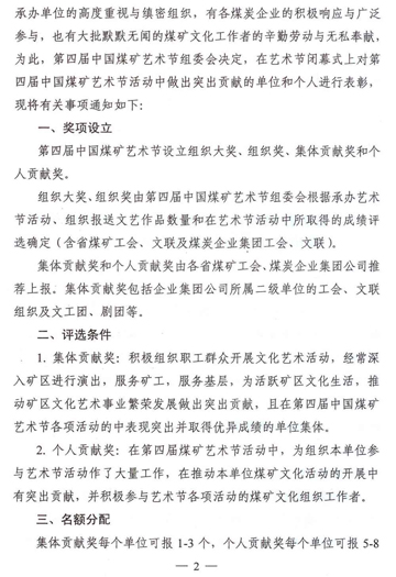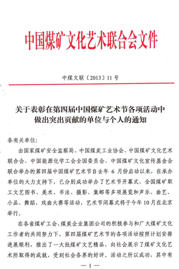 關(guān)于表彰在第四屆中國(guó)煤礦藝術(shù)節(jié)各項(xiàng)活動(dòng)中做出突出貢獻(xiàn)的單位與個(gè)人的通知