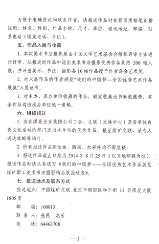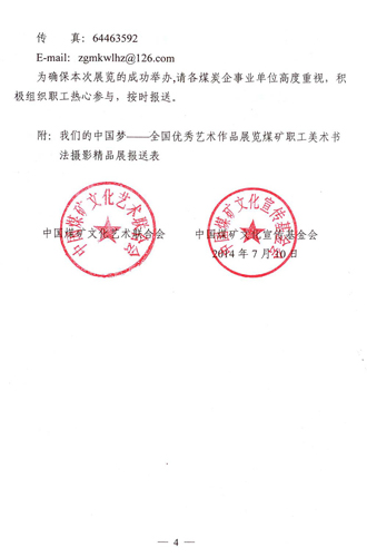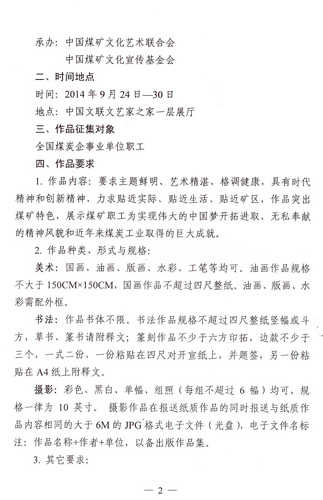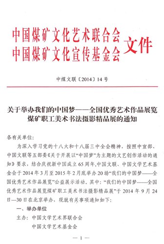 關(guān)于舉辦我們的中國夢——全國優(yōu)秀藝術(shù)作品展覽煤礦職工美術(shù)書法攝影精品展的通知 來源:中國煤礦文化網(wǎng) 作者: 時間:2014-08-04 【字體:小 大】 附:我們的中國夢——全國優(yōu)秀藝術(shù)作品展覽煤礦職工美術(shù)書法攝影精品展報送表 分享到: 【打印正文】