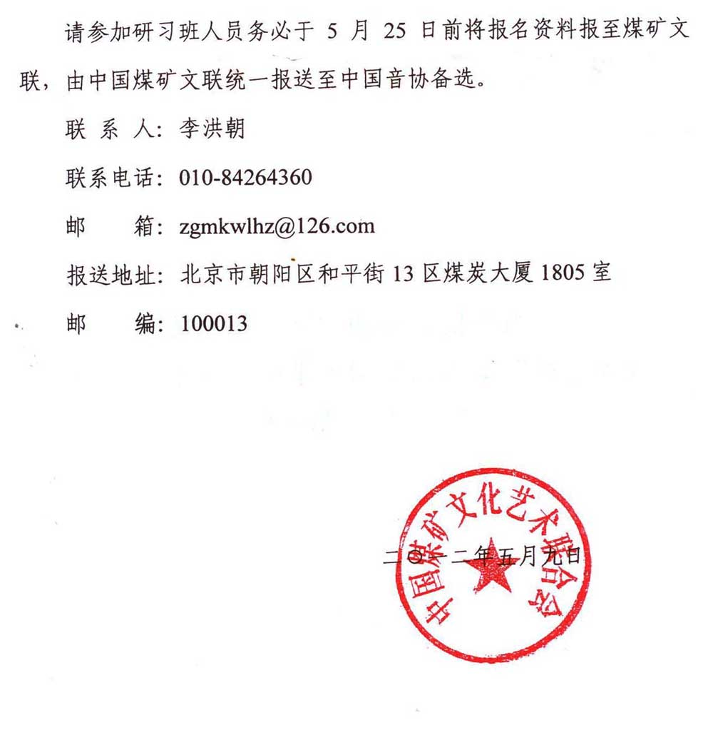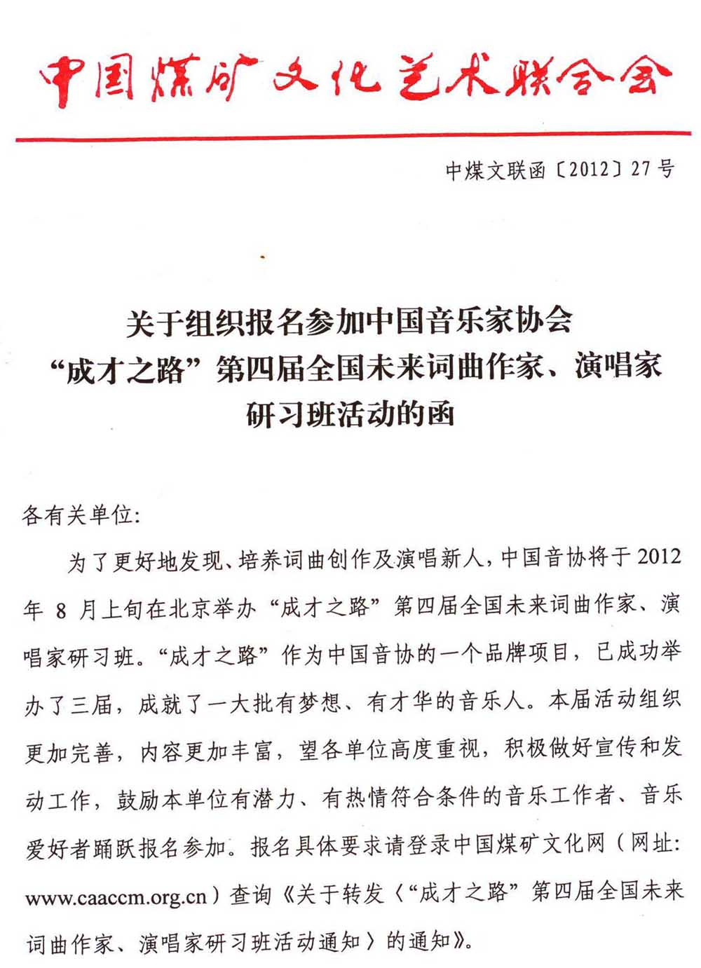 關(guān)于組織報(bào)名參加中國(guó)音樂(lè)家協(xié)會(huì)“成才之路”第四屆全國(guó)未來(lái)詞曲作家、演唱家研習(xí)班活動(dòng)的函 來(lái)源:中國(guó)煤礦文化網(wǎng) 作者:煤礦文聯(lián) 時(shí)間:2012-05-11 【字體:小 大】 附:關(guān)于轉(zhuǎn)發(fā)《成才之路第四屆全國(guó)未來(lái)詞曲作家、演唱家研習(xí)班活動(dòng)通知》的通知 分享到: 【打印正文】