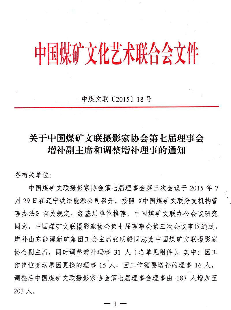 關(guān)于中國(guó)煤礦文聯(lián)攝影家協(xié)會(huì)第七屆理事會(huì)增補(bǔ)副主席和調(diào)整增補(bǔ)理事的通知