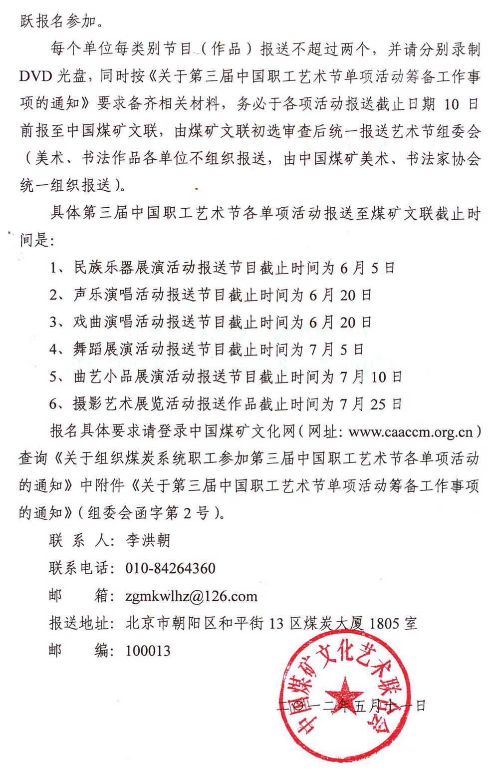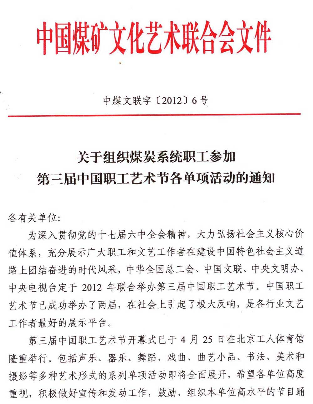 關于組織煤炭系統職工參加第三屆中國職工藝術節各單項活動的通知 來源:中國煤礦文化網 作者:煤礦文聯 時間:2012-05-11 【字體:小 大】 附:關于第三屆中國職工藝術節單項活動籌備工作事項的通知(組委會函字第2號) 分享到: 【打印正文】