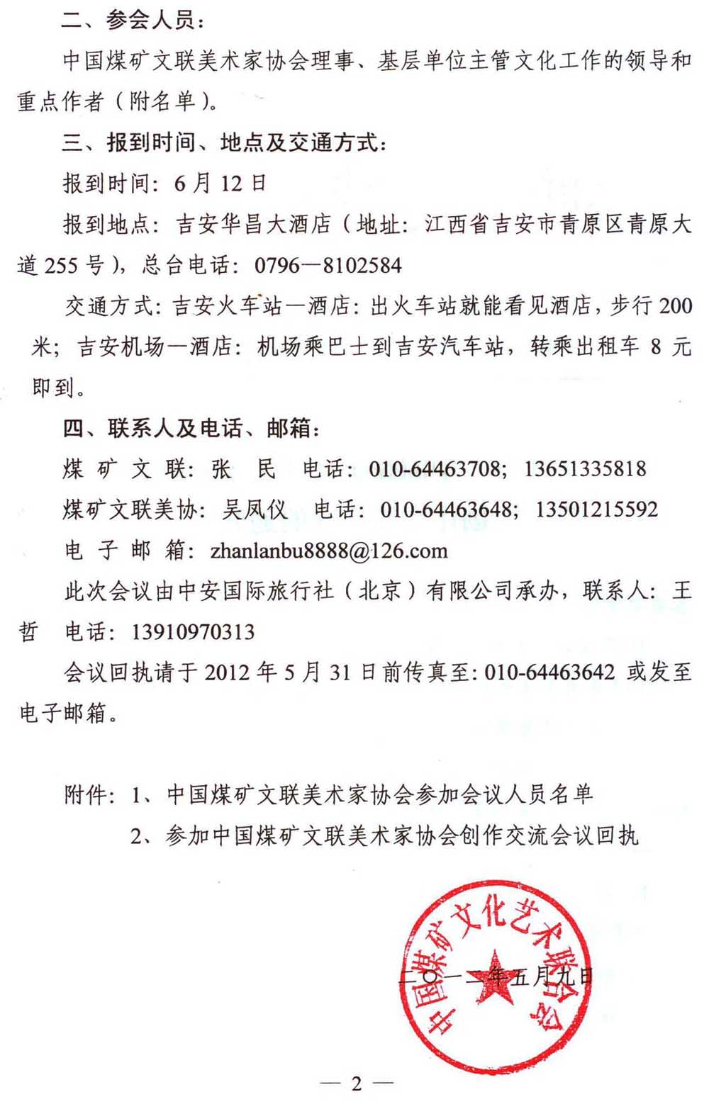 關于召開中國煤礦文聯美術家協會創作交流會議的通知 來源:中國煤礦文化網 作者:煤礦文聯 時間:2012-05-11 【字體:小 大】 附件: 1、中國煤礦文聯美術家協會參加會議人員名單 2、參加中國煤礦文聯美術家協會創作交流會議回執 分享到: 【打印正文】