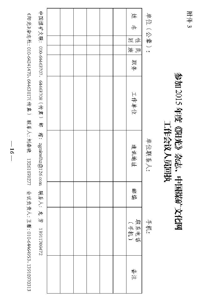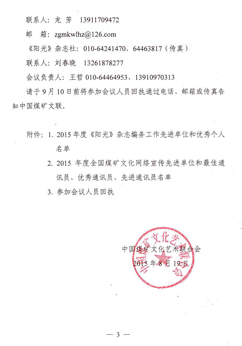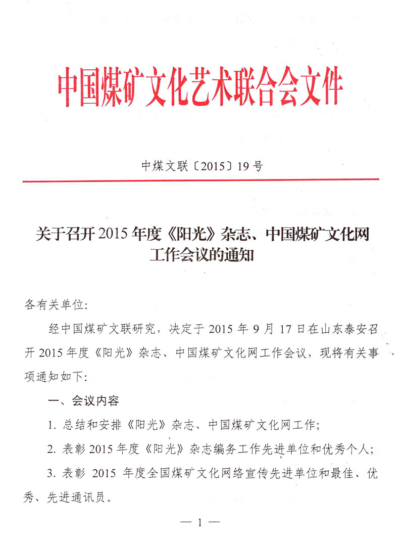 關于召開2015年度《陽光》雜志、中國煤礦文化網工作會議的通知 來源: 作者: 時間:2015-08-21 【字體:小 大】 附件: 1. 2015年度《陽光》雜志編務工作先進單位和優秀個人 名單 2. 2015年度全國煤礦文化網絡宣傳先進單位和最佳通 訊員、優秀通訊員、先進通訊員名單 3. 參加會議人員回執 智能標簽: 陽光 煤礦文化網 相關內容 分享到: 【打印正文】