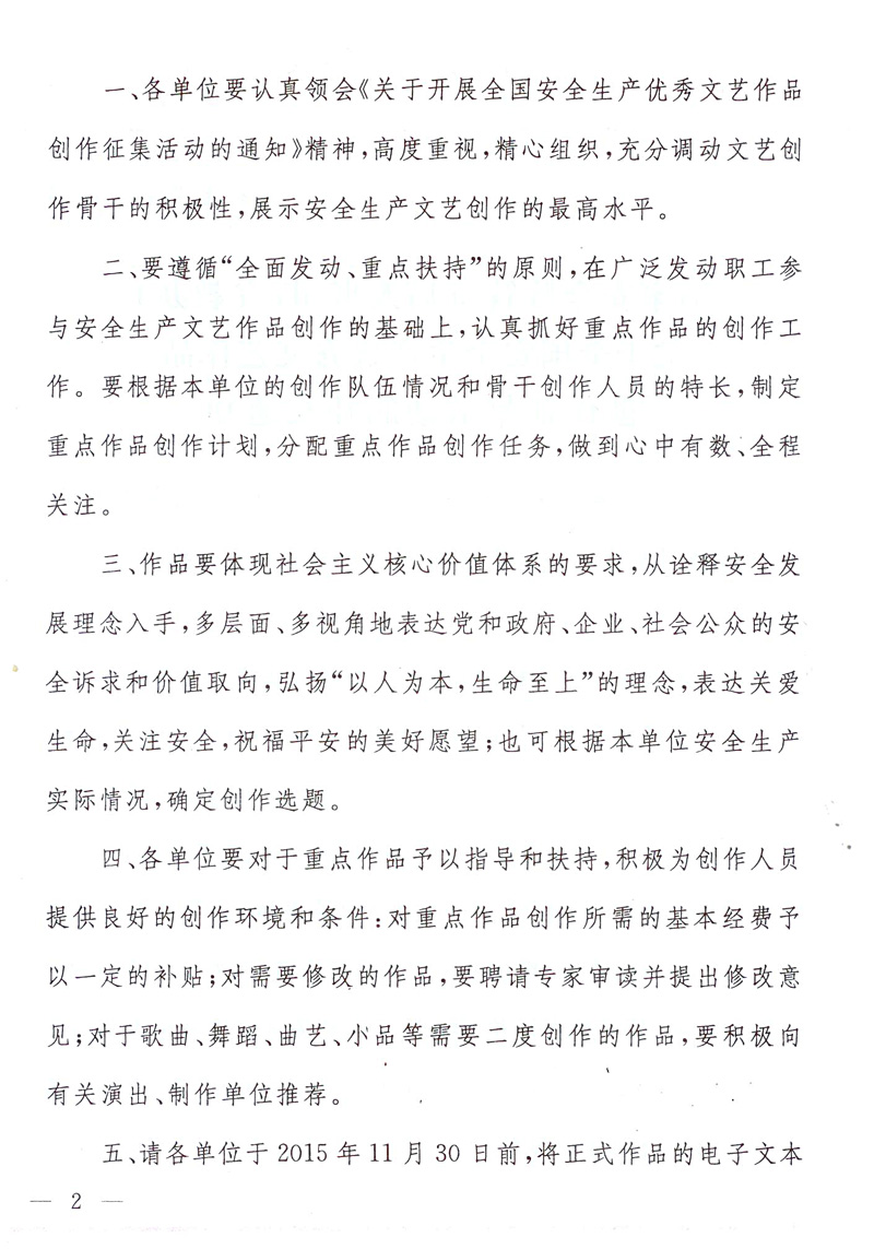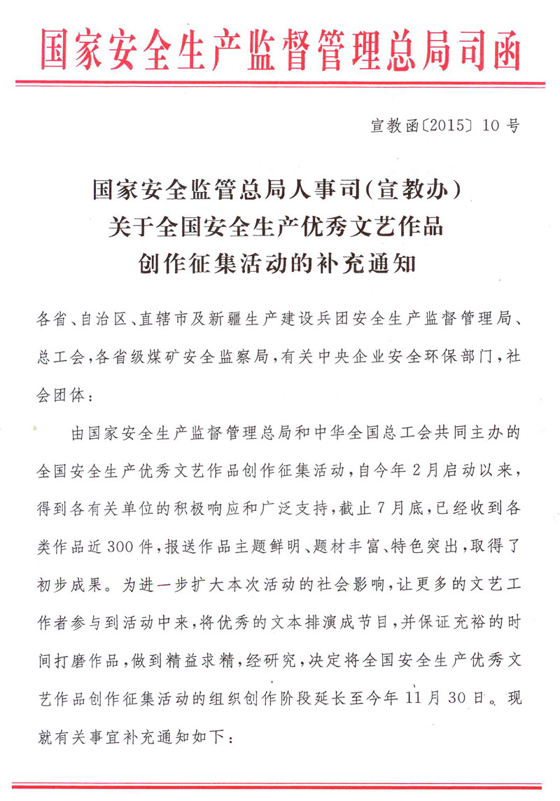 關于全國安全生產優秀文藝作品創作征集活動的補充通知