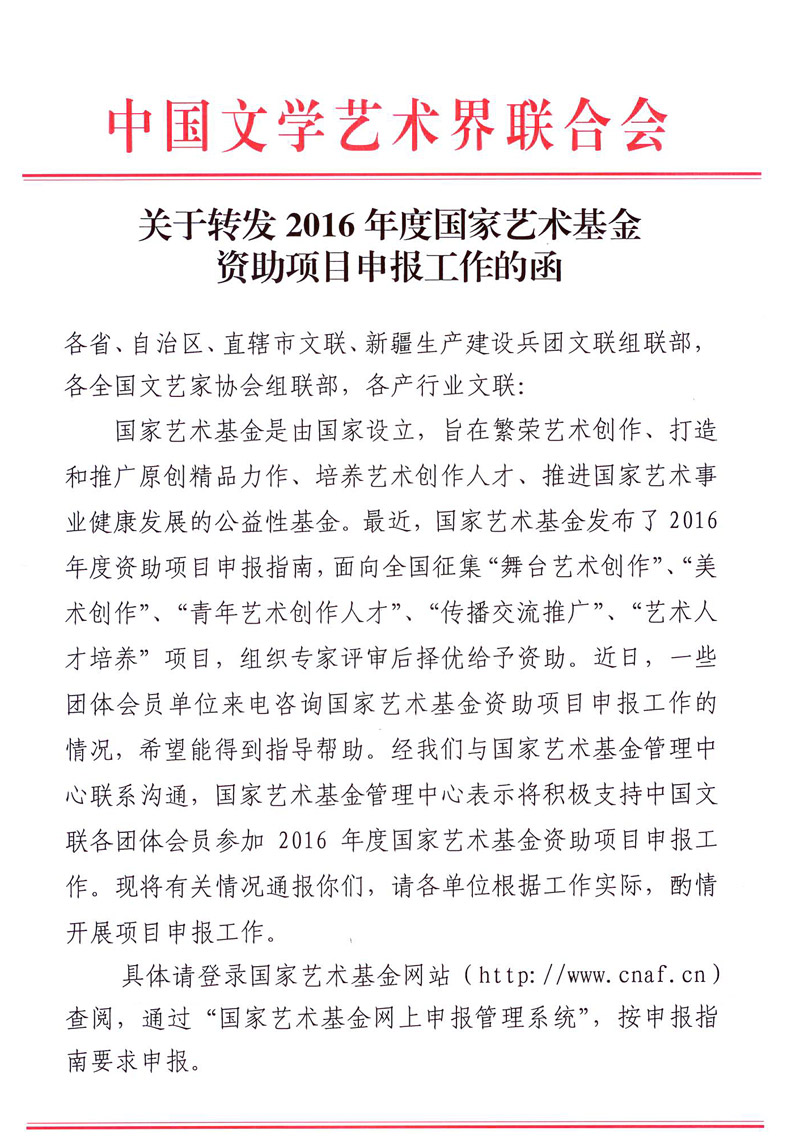 中國文聯:關于轉發2016年度國家藝術基金資助項目申報工作的函