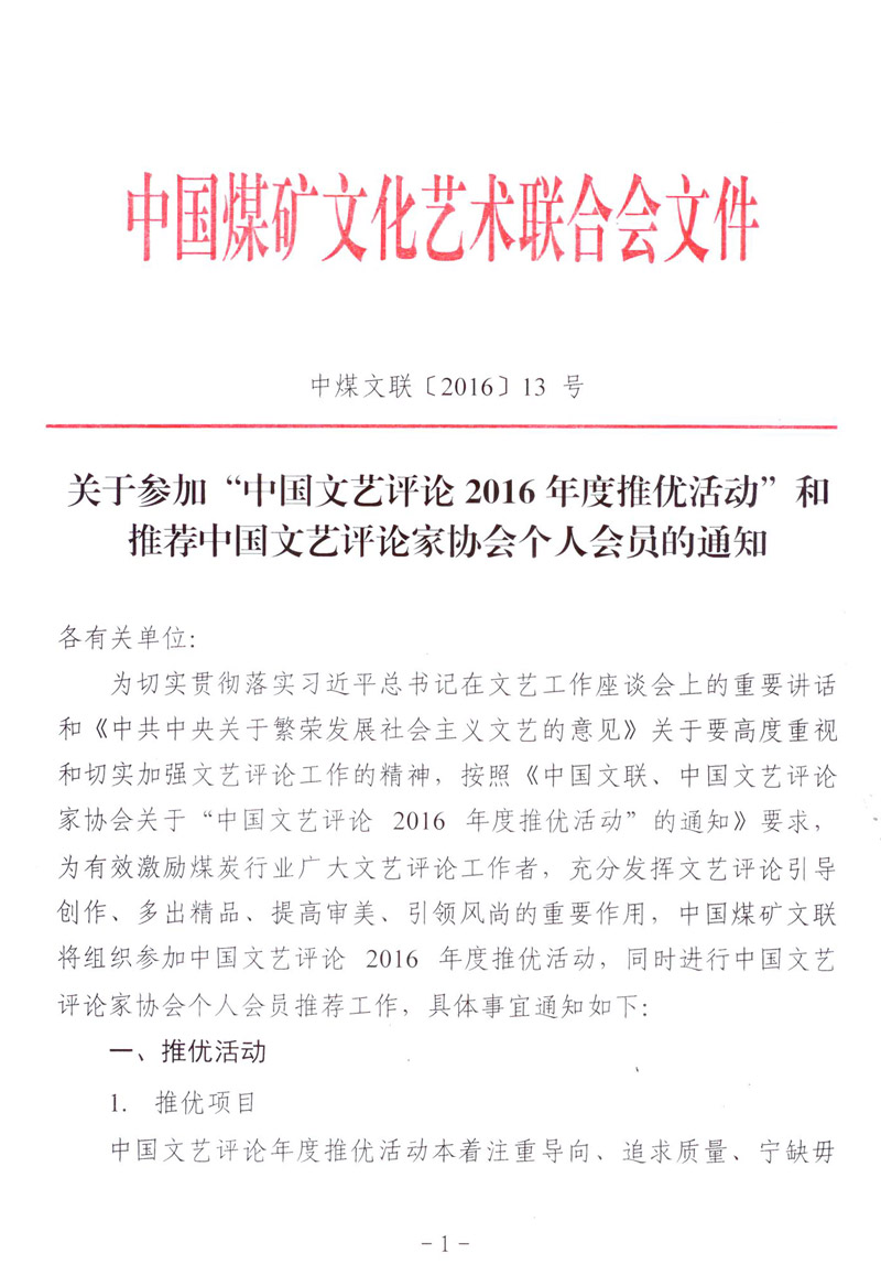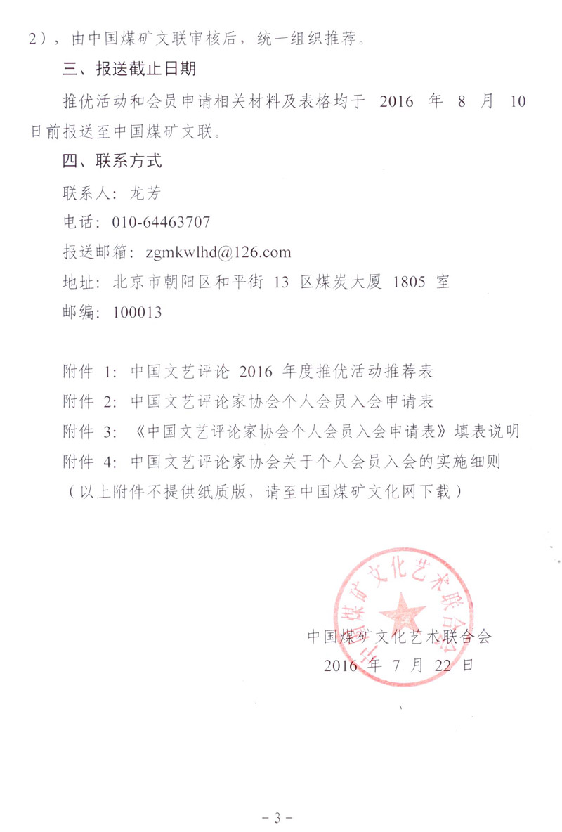 關(guān)于參加“中國(guó)文藝評(píng)論2016年度推優(yōu)活動(dòng)”和推薦中國(guó)文藝評(píng)論家協(xié)會(huì)個(gè)人會(huì)員的通知 來(lái)源:中國(guó)煤礦文聯(lián) 作者: 時(shí)間:2016-07-22 【字體:小 大】 附件1:中國(guó)文藝評(píng)論2016年度推優(yōu)活動(dòng)推薦表 附件2:中國(guó)文藝評(píng)論家協(xié)會(huì)個(gè)人會(huì)員入會(huì)申請(qǐng)表 附件3:《中國(guó)文藝評(píng)論家協(xié)會(huì)個(gè)人會(huì)員入會(huì)申請(qǐng)表》填表說(shuō)明 附件4:中國(guó)文藝評(píng)論家協(xié)會(huì)關(guān)于個(gè)人會(huì)員入會(huì)的實(shí)施細(xì)則 智能標(biāo)簽: 中國(guó)文藝評(píng)論 相關(guān)內(nèi)容 分享到: 【打印正文】