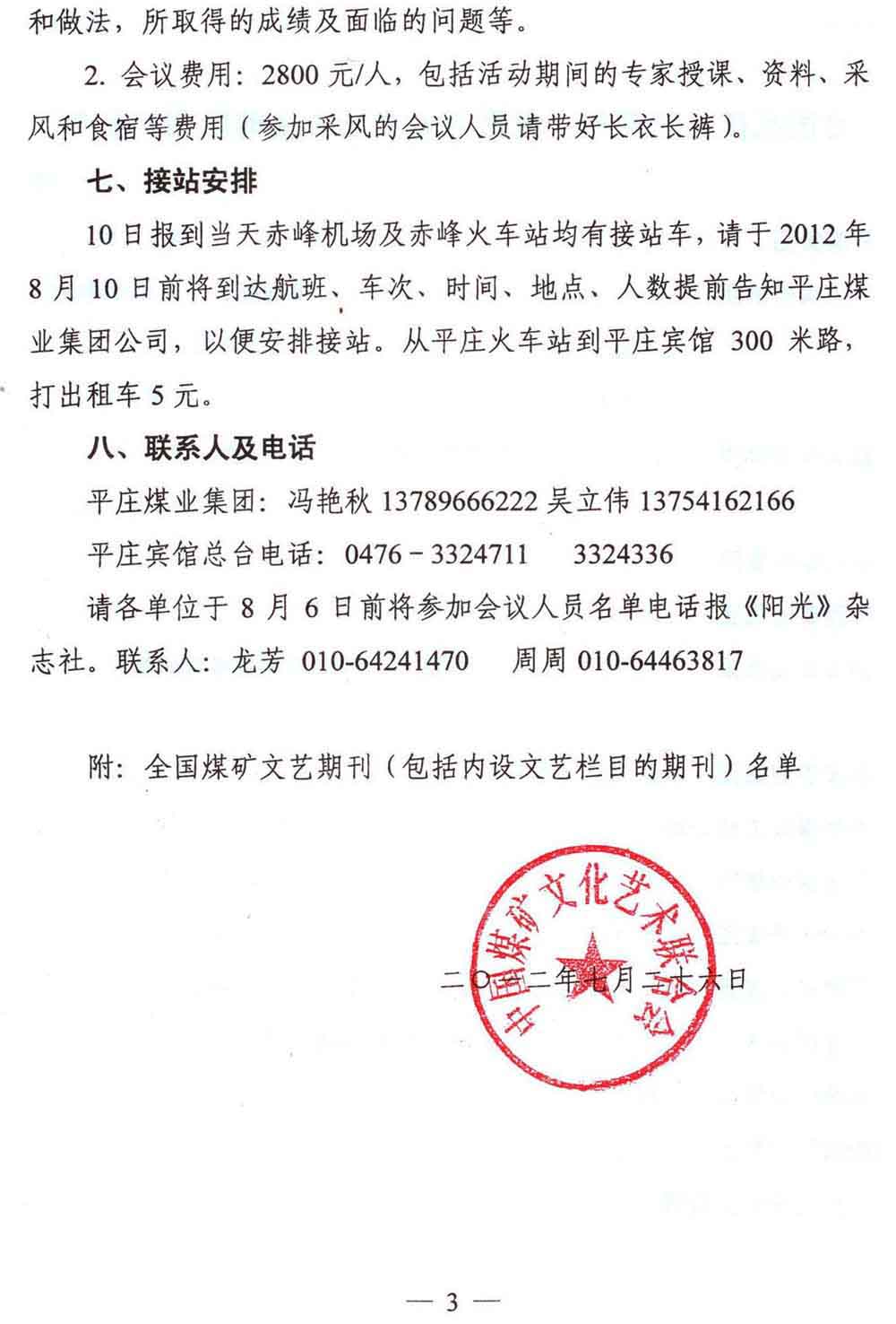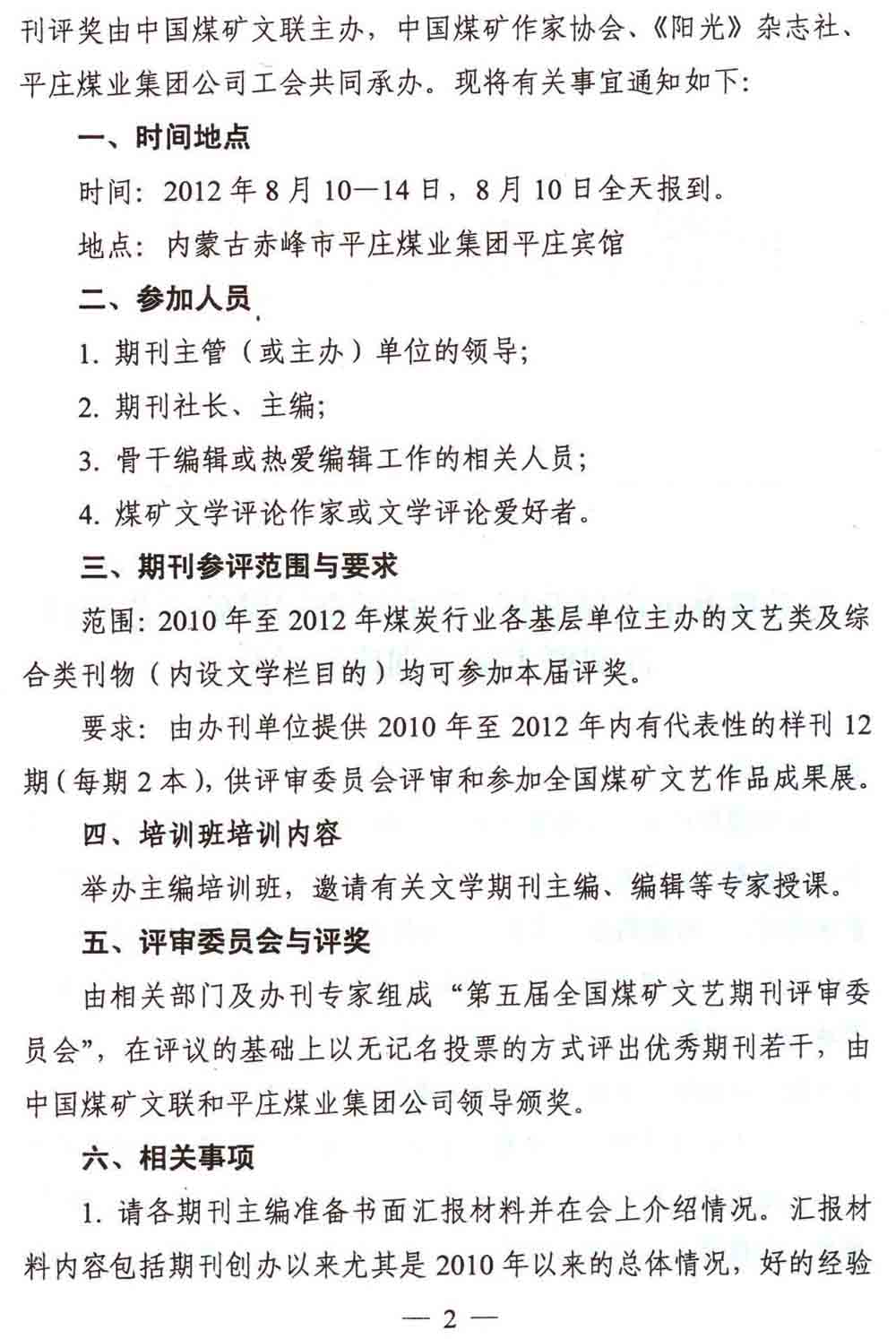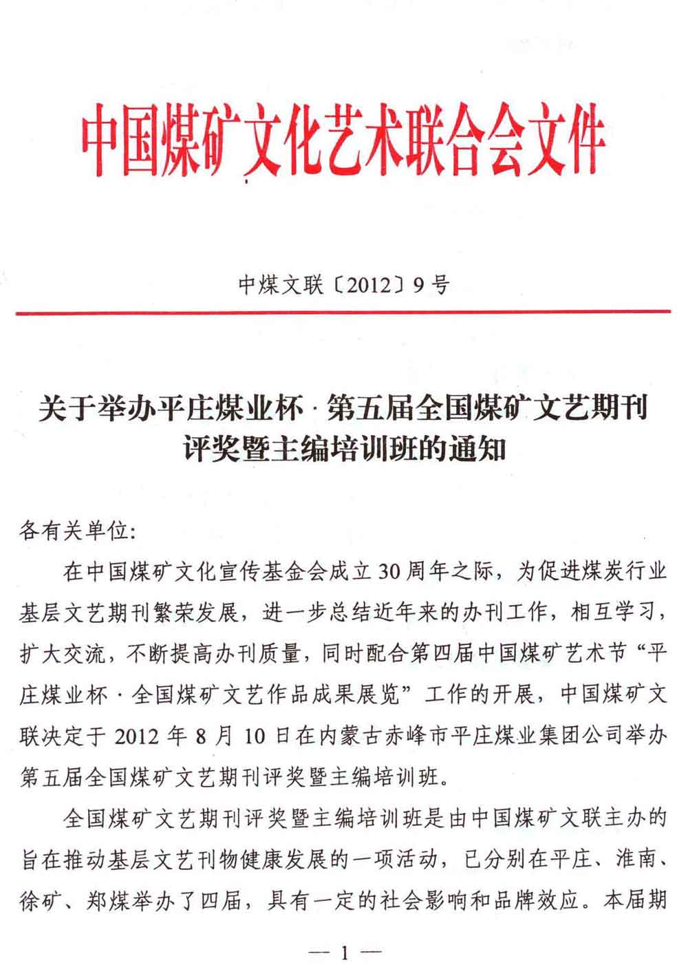 關(guān)于舉辦平莊煤業(yè)杯·第五屆全國(guó)煤礦文藝期刊評(píng)獎(jiǎng)暨主編培訓(xùn)班的通知 來(lái)源:中國(guó)煤礦文化網(wǎng) 作者:煤礦文聯(lián) 時(shí)間:2012-07-27 【字體:小 大】 分享到: 【打印正文】