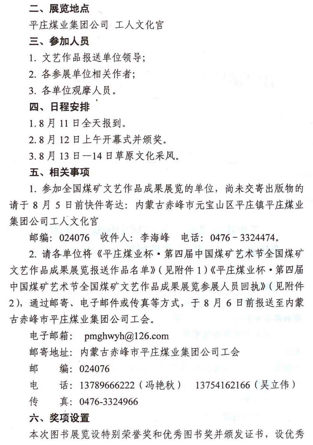 關于平莊煤業杯·第四屆中國煤礦藝術節全國煤礦文藝作品成果展覽有關事項的通知 來源:中國煤礦文化網 作者:煤礦文聯 時間:2012-07-27 【字體:小 大】 附件:平莊煤業杯·第四屆中國煤礦藝術節全國煤礦文藝作品成果展覽報送作品名單及參展人員回執 分享到: 【打印正文】