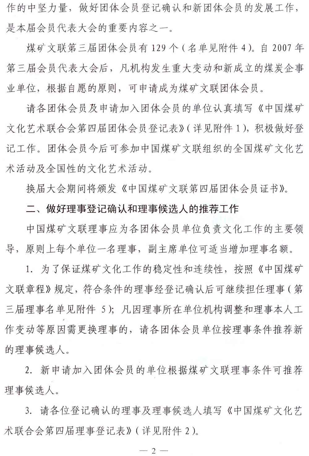 關于做好中國煤礦文聯第四屆會員代表大會籌備工作的通知 來源:中國煤礦文化網 作者:煤礦文聯 時間:2012-11-19 【字體:小 大】 附件: 1、中國煤礦文化藝術聯合會第四屆團體會員登記表 2、中國煤礦文化藝術聯合會第四屆理事登記表 3、修改《中國煤礦文化藝術聯合會章程》征求意見表 4、中國煤礦文化藝術聯合會第三屆團體會員名單 5、中國煤礦文化藝術聯合會第三屆理事名單 分享到: 【打印正文】