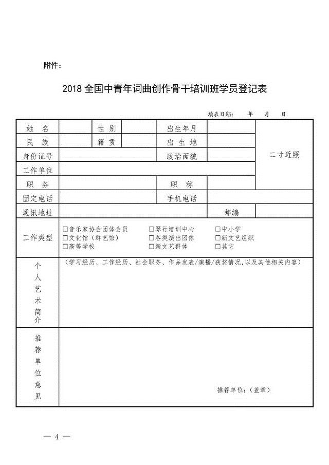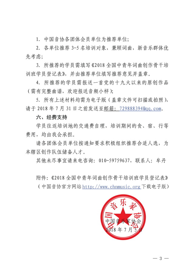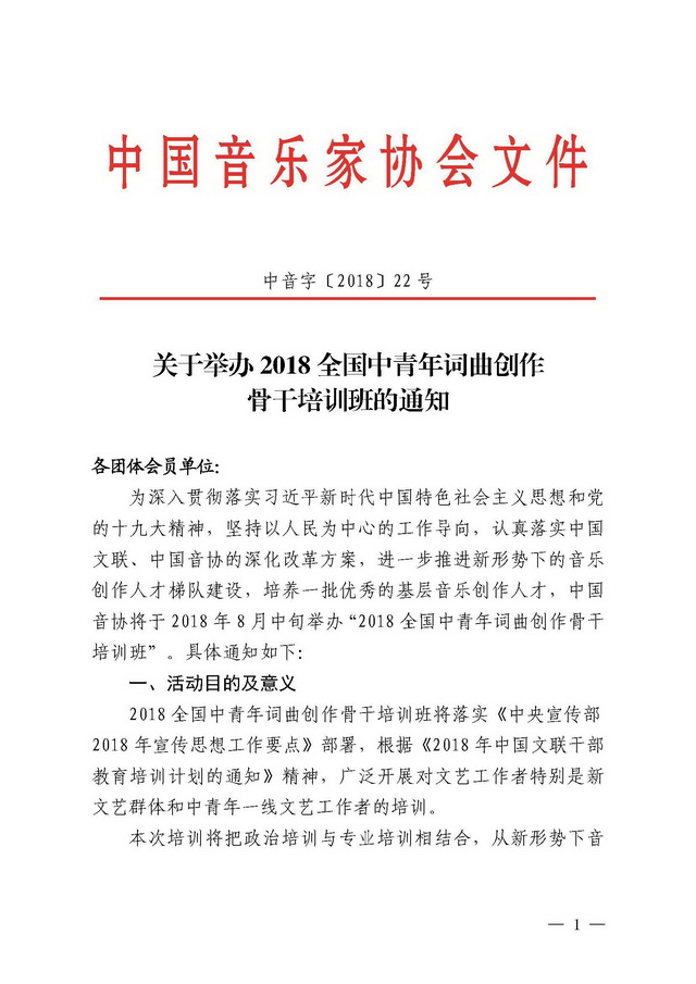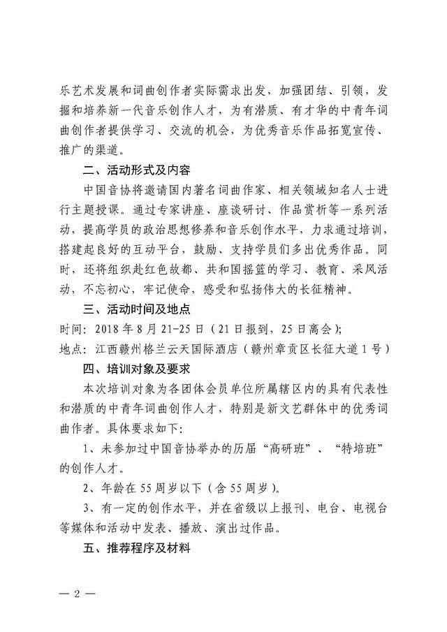 中國音協:關于舉辦2018全國中青年詞曲創作骨干培訓班的通知 來源:中國音協 作者: 時間:2018-07-24 【字體:小 大】 附件1下載:關于舉辦2018全國中青年詞曲創作骨干培訓班的通知pdf版附件2下載:《2018全國中青年詞曲創作骨干培訓班學員登記表》word版 智能標簽: 中國音協 相關內容 分享到: 【打印正文】