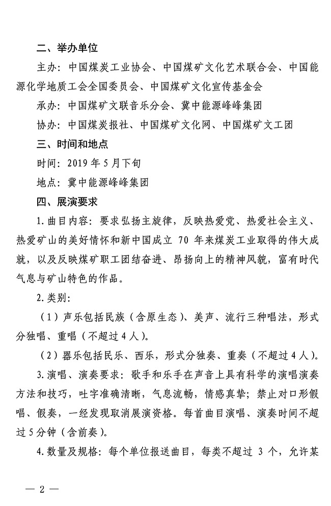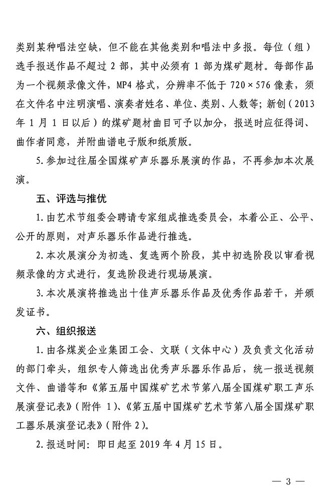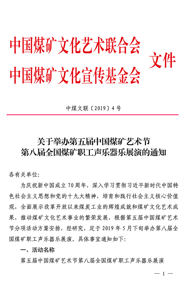關(guān)于舉辦第八屆全國(guó)煤礦職工聲樂(lè)器樂(lè)展演的通知 來(lái)源:中國(guó)煤礦文聯(lián) 作者: 時(shí)間:2019-03-11 【字體:小 大】 關(guān)于舉辦第五屆中國(guó)煤礦藝術(shù)節(jié)第八屆全國(guó)煤礦職工聲樂(lè)器樂(lè)展演的通知(PDF版)附件:1.第五屆中國(guó)煤礦藝術(shù)節(jié)第八屆全國(guó)煤礦職工聲樂(lè)展演登記表2.第五屆中國(guó)煤礦藝術(shù)節(jié)第八屆全國(guó)煤礦職工器樂(lè)展演登記表 智能標(biāo)簽: 中國(guó)煤礦藝術(shù)節(jié) 相關(guān)內(nèi)容 分享到: 【打印正文】