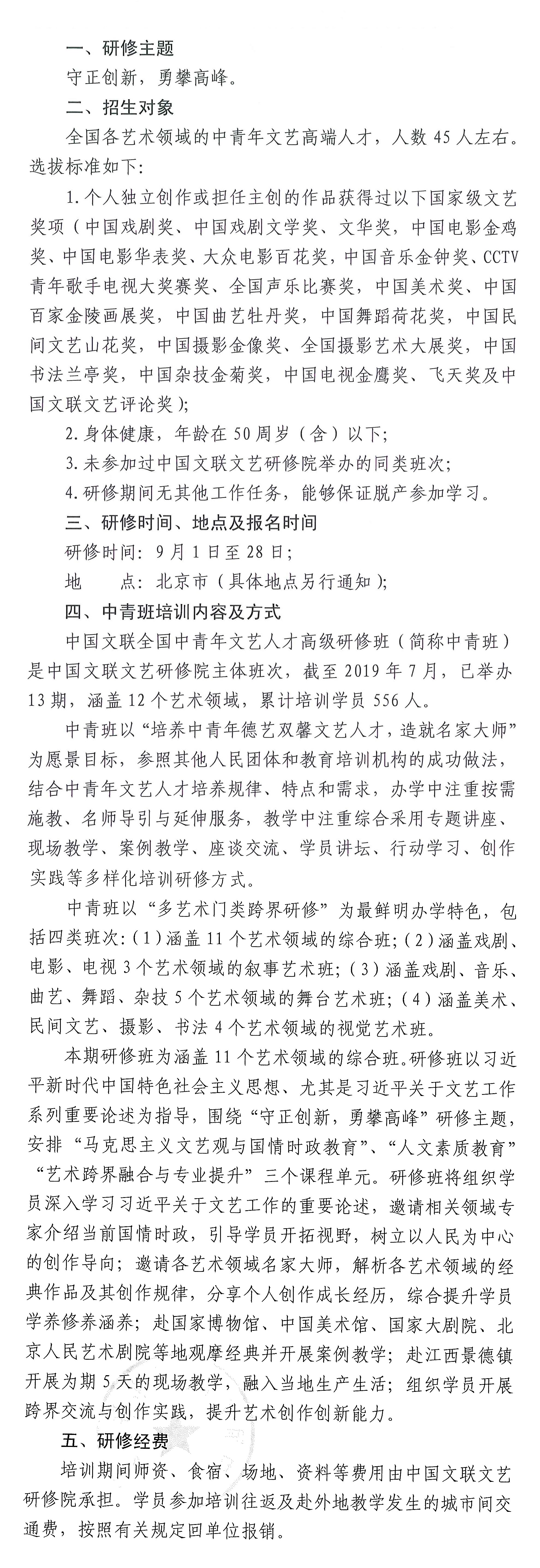 接中國(guó)文聯(lián)通知,中國(guó)文聯(lián)文藝研修院將于9月1日至28日在北京舉辦第十四期全國(guó)中青年文藝人才高級(jí)研修班。
