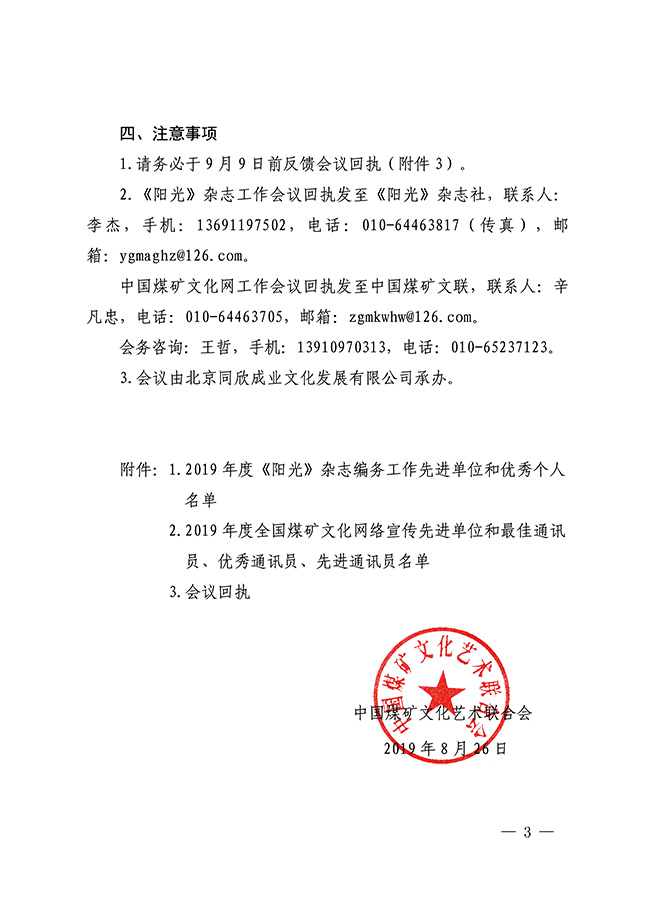 關于召開2019年度《陽光》雜志、中國煤礦文化網工作會議的通知 來源:中國煤礦文聯 作者: 時間:2019-09-02 【字體:小 大】 附件:· 關于召開2019年度《陽光》雜志、中國煤礦文化網工作會議的通知(PDF版,含附件1-2)· 會議回執(附件3) 智能標簽: 中國煤礦文聯 相關內容 分享到: 【打印正文】