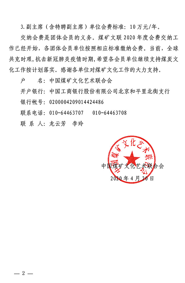 關(guān)于交納二○二○年度會費的通知 來源:中國煤礦文聯(lián) 作者: 時間:2020-04-23 【字體:小 大】 附件:關(guān)于交納二○二○年度會費的通知(PDF版) 智能標簽: 中國煤礦文聯(lián) 相關(guān)內(nèi)容 分享到: 【打印正文】