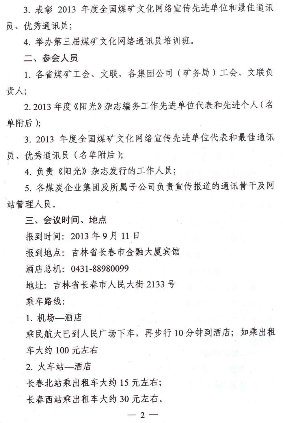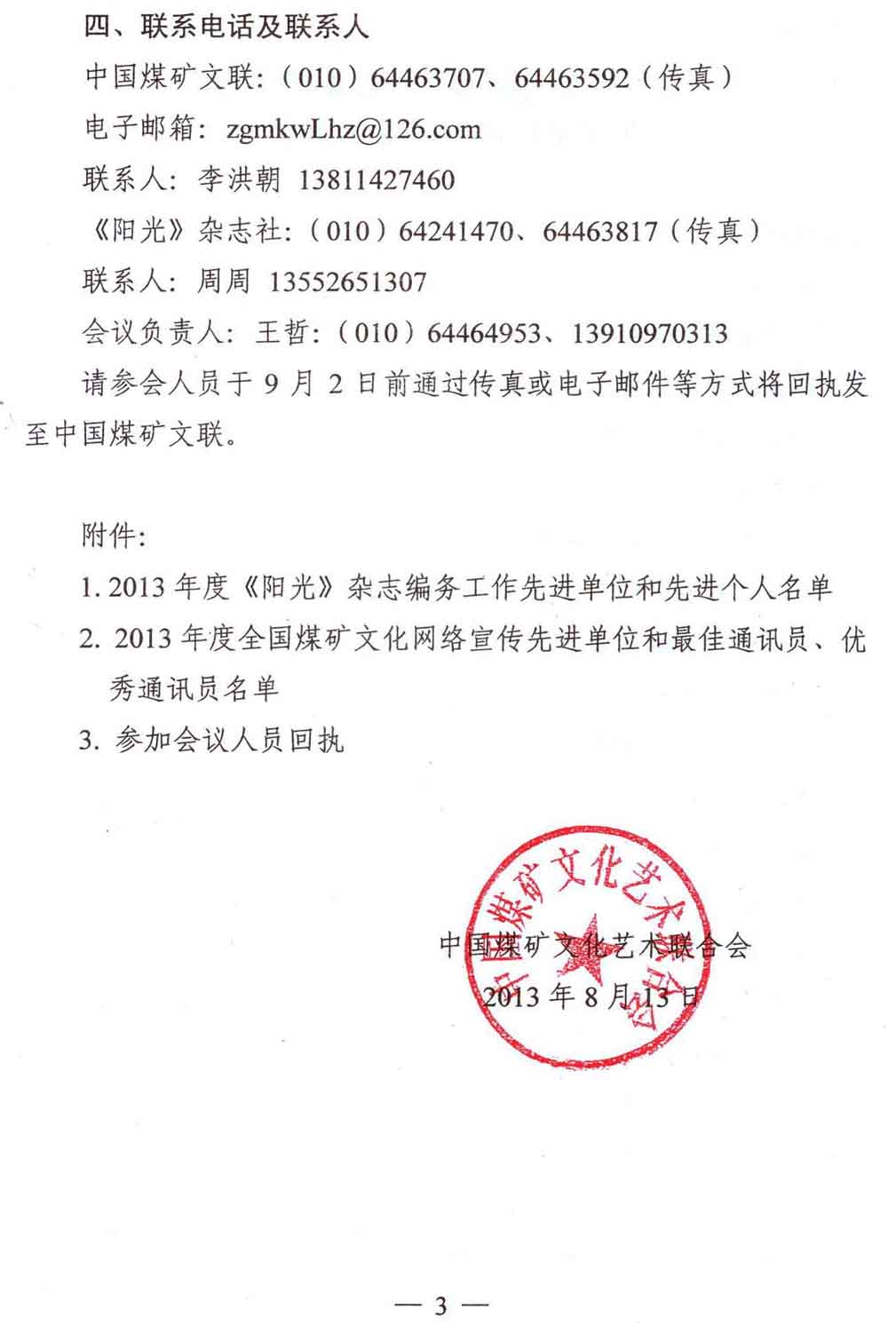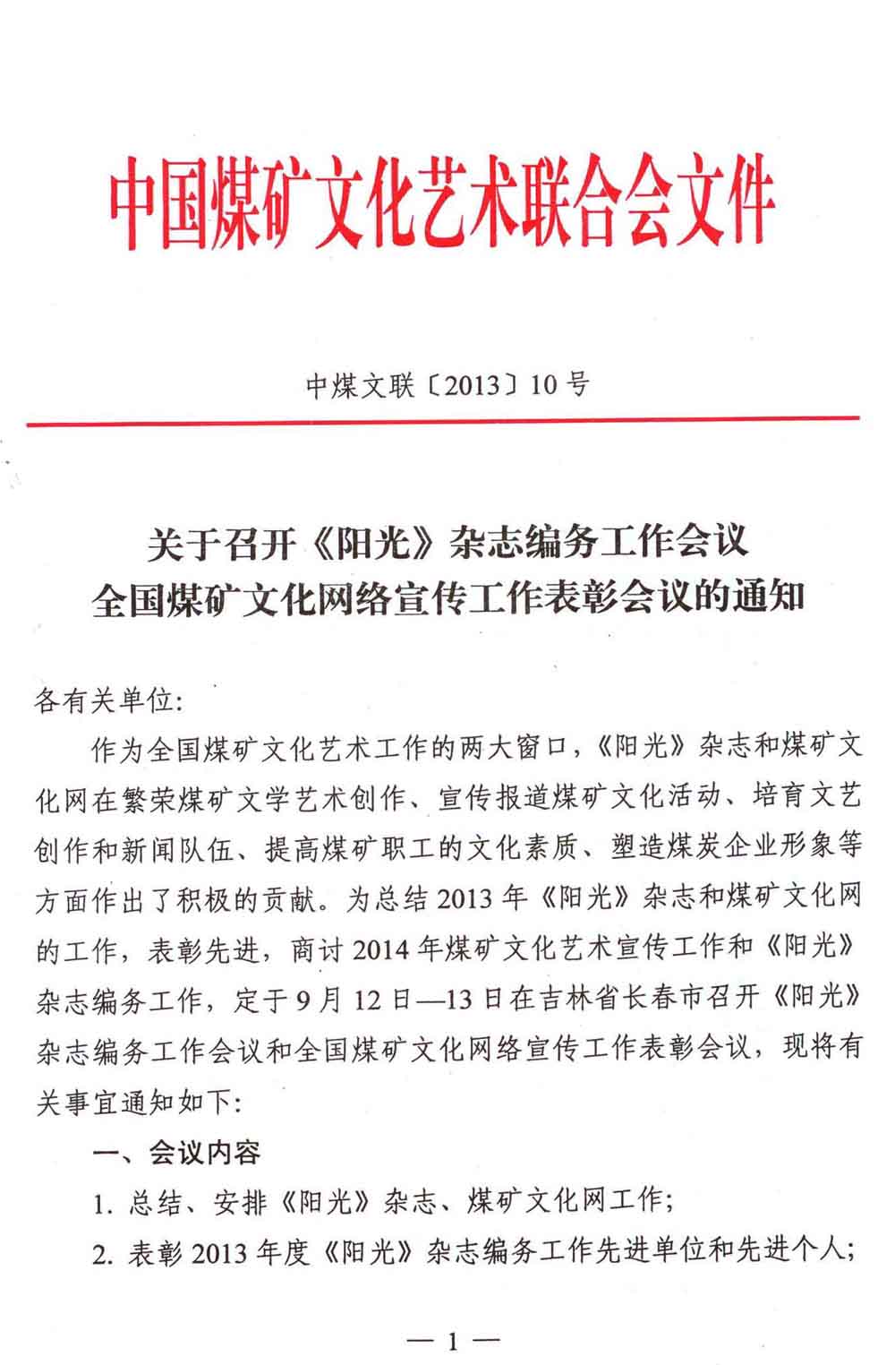 關(guān)于召開《陽光》雜志編務(wù)工作會議暨全國煤礦文化網(wǎng)絡(luò)宣傳工作表彰會議的通知 來源:中國煤礦文化網(wǎng) 作者:煤礦文聯(lián) 時間:2013-08-16 【字體:小 大】 附件:參加《陽光》雜志編務(wù)工作會議和全國煤礦文化網(wǎng)絡(luò)宣傳工作表彰會議人員回執(zhí) 分享到: 【打印正文】
