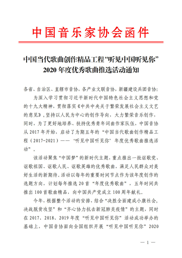 中國(guó)音協(xié):中國(guó)當(dāng)代歌曲創(chuàng)作精品工程“聽見中國(guó)聽見你”2020年度優(yōu)秀歌曲推選 活動(dòng)通知 來源:中國(guó)音協(xié) 作者: 時(shí)間:2020-10-12 【字體:小 大】 附件1:2020聽見中國(guó)聽見你方案(定版)附件2:2020聽見中國(guó)聽見你個(gè)人作品登記表附件3:2020聽見中國(guó)聽見你團(tuán)體作品報(bào)送表(定版) 分享到: 【打印正文】