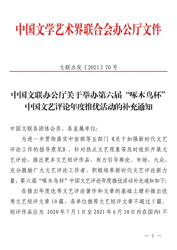 其他要求請(qǐng)參見《中國(guó)文聯(lián)辦公廳關(guān)于舉辦第六屆“啄木鳥杯”中國(guó)文藝評(píng)論年度推優(yōu)活動(dòng)的通知》(文聯(lián)辦發(fā)〔2021〕63號(hào))。