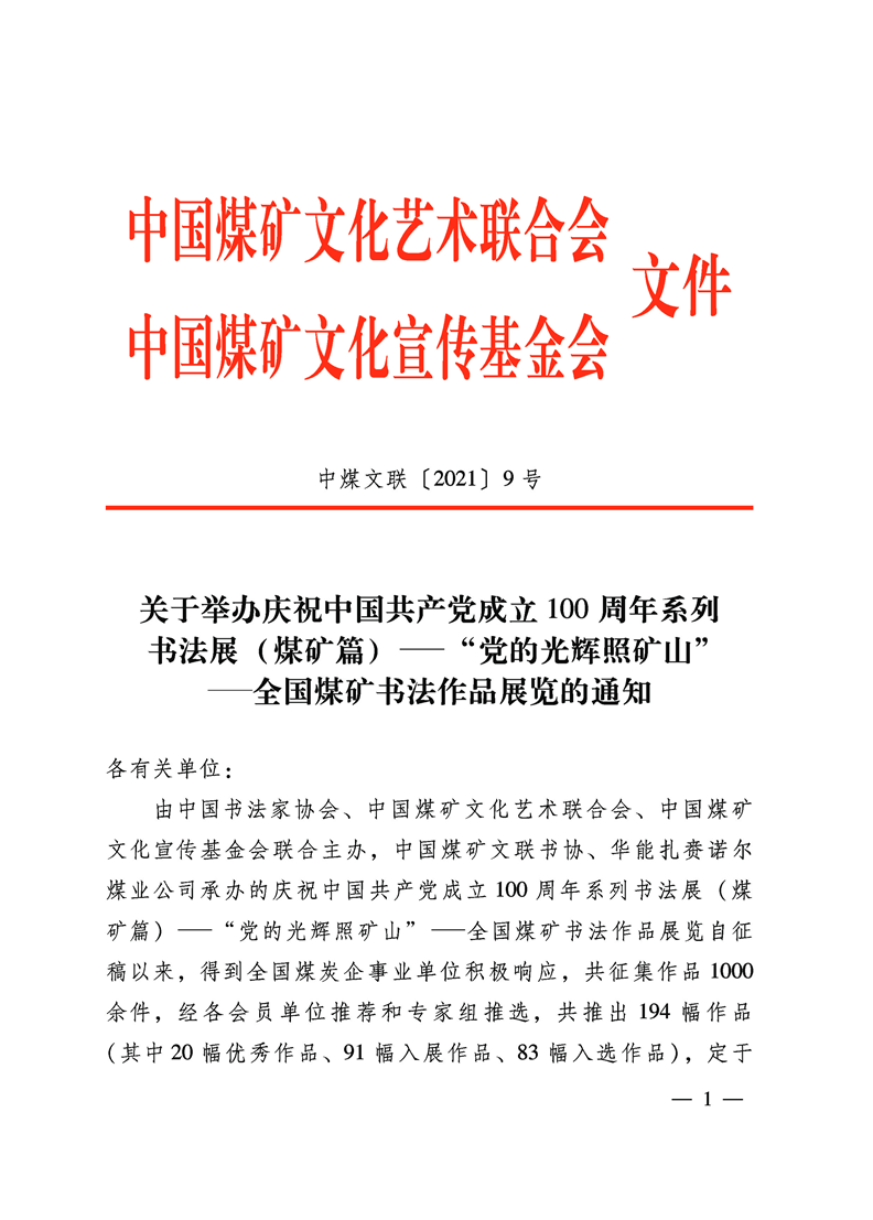 關于舉辦慶祝中國共產黨成立100周年系列書法展(煤礦篇)——“黨的光輝照礦山”——全國煤礦書法作品展覽的通知
