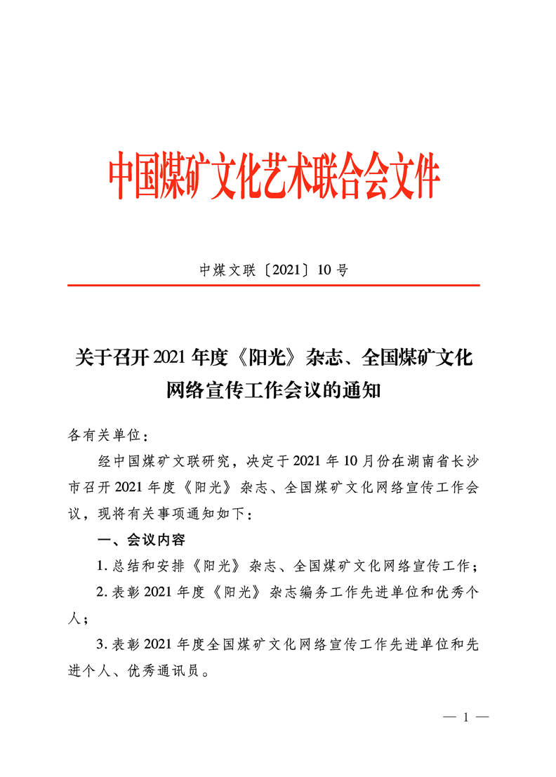 關于召開2021年度《陽光》雜志、全國煤礦文化網絡宣傳工作會議的通知
