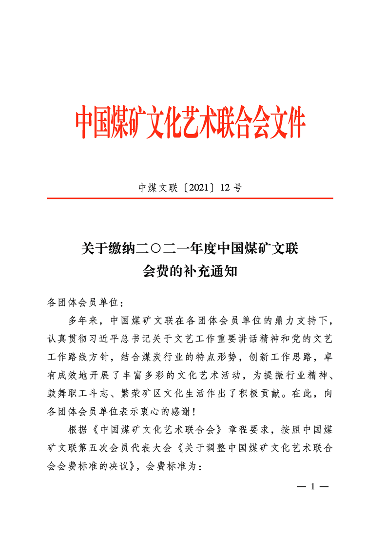 關于繳納二○二一年度中國煤礦文聯會費的補充通知