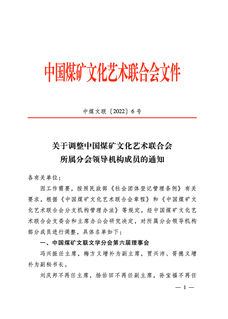 關于調整中國煤礦文聯所屬分會領導機構成員的通知