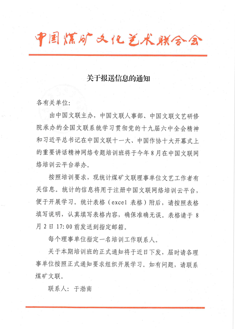 關(guān)于報(bào)送信息的通知 來源: 作者: 時(shí)間:2022-07-29 【字體:小 大】 全國(guó)文聯(lián)系統(tǒng)學(xué)習(xí)貫徹黨的十九屆六中全會(huì)精神和習(xí)近平總書記在中國(guó)文聯(lián)十一大、中國(guó)作協(xié)十大開幕式上的重要講話精神網(wǎng)絡(luò)專題培訓(xùn)班學(xué)員信息統(tǒng)計(jì)表.xlsx 分享到: 【打印正文】