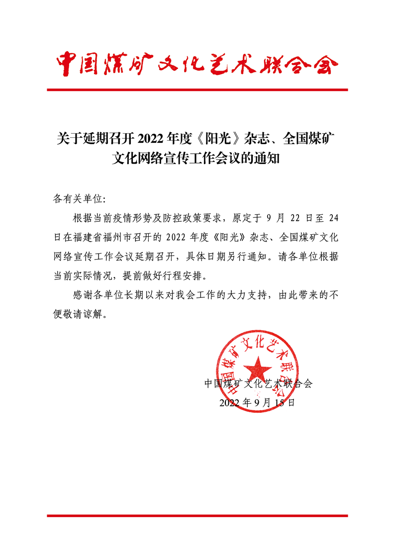 關于延期召開2022年度《陽光》雜志、全國煤礦文化網絡宣傳工作會議的通知