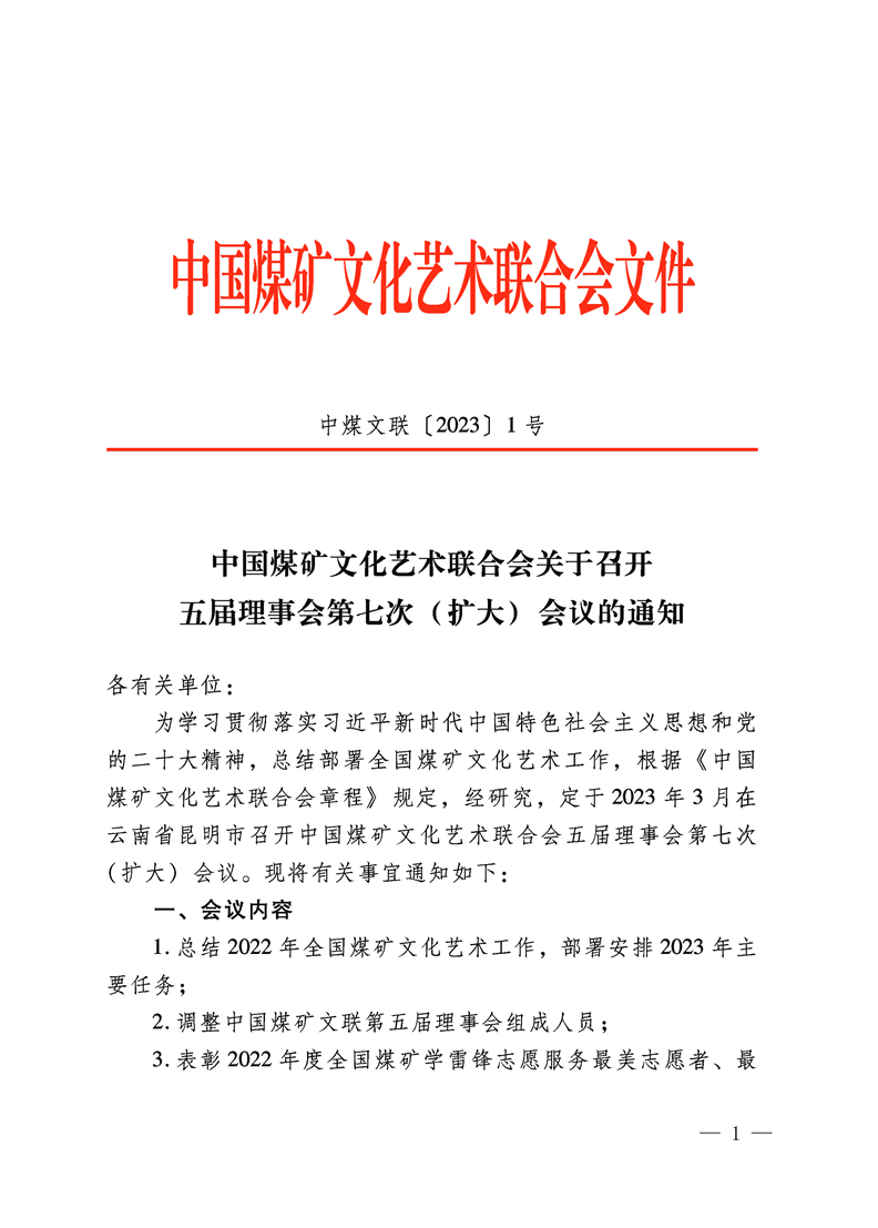 中國煤礦文化藝術聯合會關于召開五屆理事會第七次(擴大)會議的通知