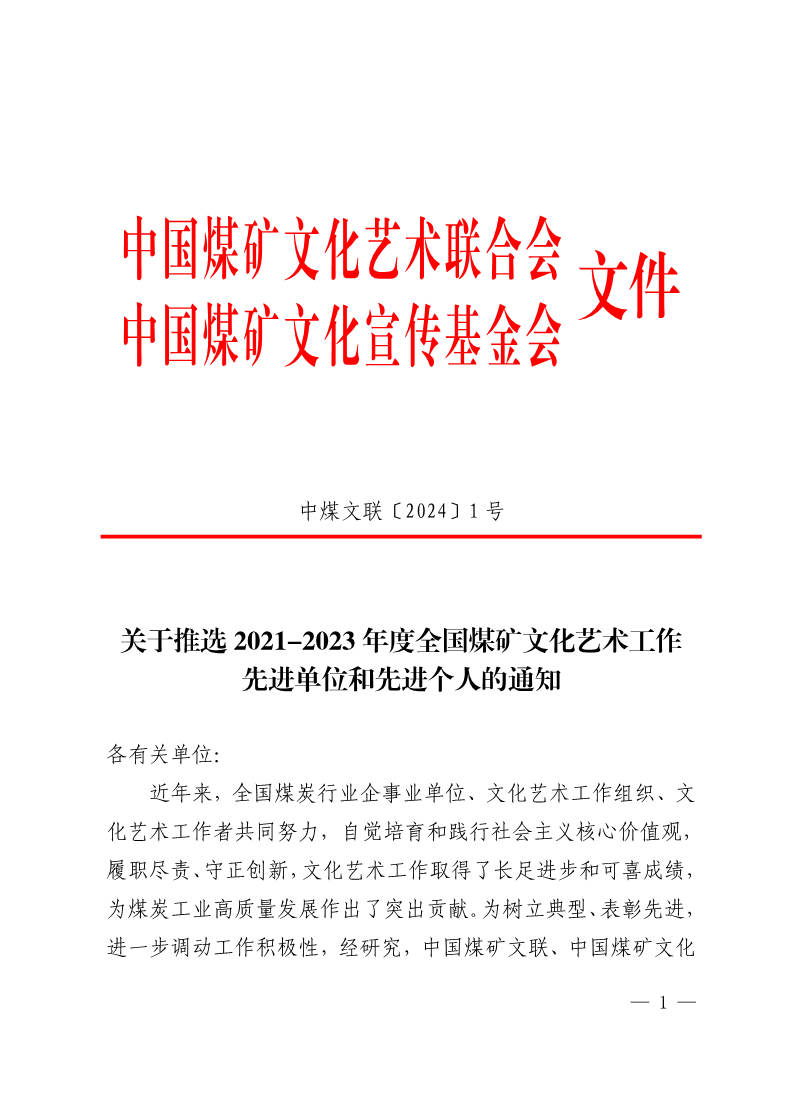 關于推選2021-2023年度全國煤礦文化藝術工作先進單位和先進個人的通知 來源:中國煤礦文聯 作者: 時間:2024-01-09 【字體:小 大】 附件(2-3):2021-2023年度全國煤礦文化藝術工作先進單位推薦表2021-2023年度全國煤礦文化藝術工作先進個人推薦表 分享到: 【打印正文】