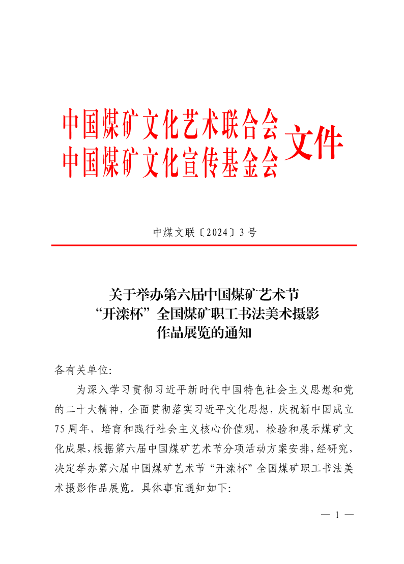 關(guān)于舉辦第六屆中國煤礦藝術(shù)節(jié)“開灤杯”全國煤礦職工書法美術(shù)攝影作品展覽的通知 來源:中國煤礦文聯(lián) 作者: 時間:2024-03-08 【字體:小 大】 附件:1.“開灤杯”全國煤礦職工書法美術(shù)攝影作品展覽書法作品登記表2.“開灤杯”全國煤礦職工書法美術(shù)攝影作品展覽美術(shù)作品登記表3.“開灤杯”全國煤礦職工書法美術(shù)攝影作品展覽攝影作品登記表 分享到: 【打印正文】