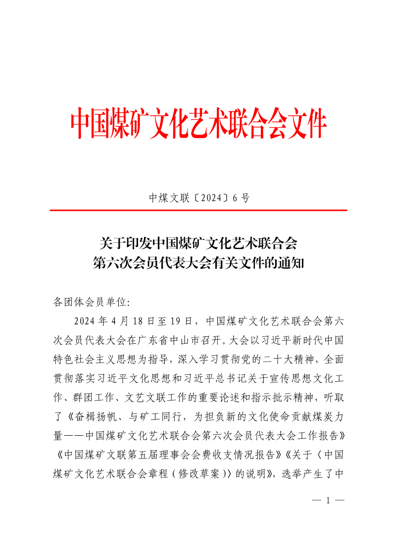 關于印發中國煤礦文化藝術聯合會第六次會員代表大會有關文件的通知