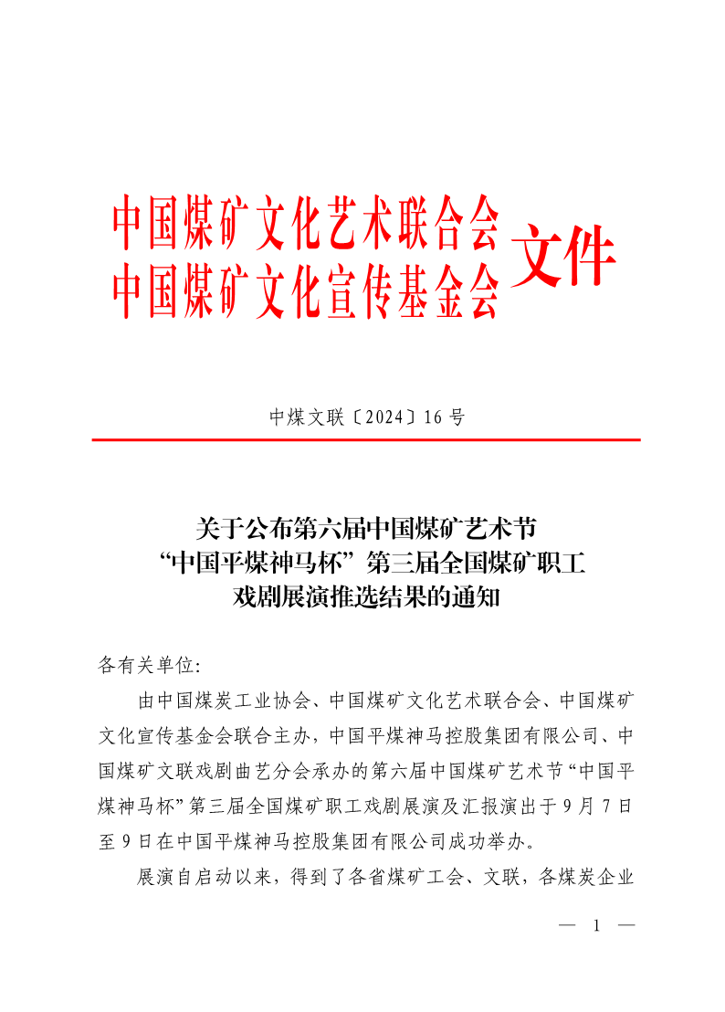 關(guān)于公布第六屆中國煤礦藝術(shù)節(jié)“中國平煤神馬杯”第三屆全國煤礦職工戲劇展演推選結(jié)果的通知