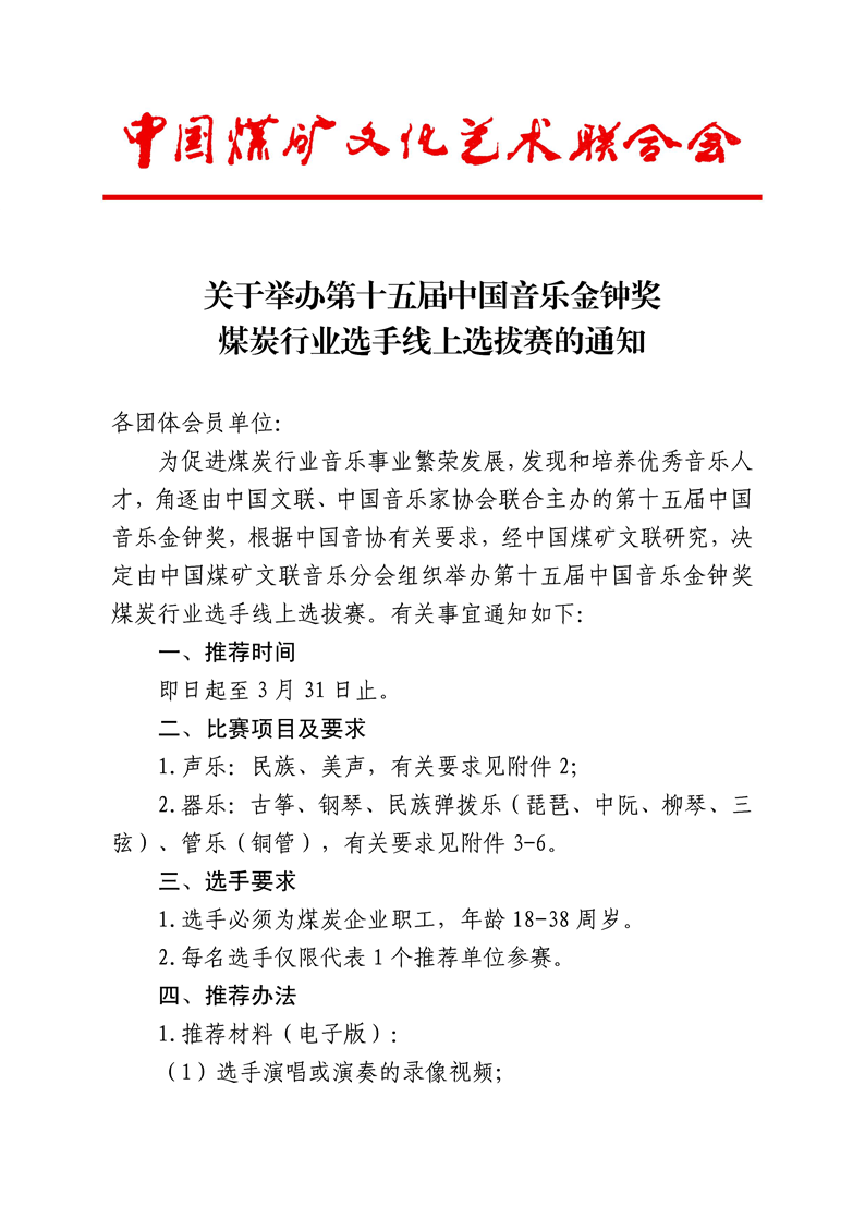 關于舉辦第十五屆中國音樂金鐘獎煤炭行業選手線上選拔賽的通知 來源:中國煤礦文聯 作者: 時間:2025-03-04 【字體:小 大】 附件:1.關于舉辦第十五屆中國音樂金鐘獎的通知2.第十五屆中國音樂金鐘獎聲樂比賽賽事安排及評選細則3.第十五屆中國音樂金鐘獎古箏比賽賽事安排及評選細則4.第十五屆中國音樂金鐘獎鋼琴比賽賽事安排及評選細則5.第十五屆中國音樂金鐘獎彈撥樂器比賽賽事安排及評選細則6.第十五屆中國音樂金鐘獎管樂比賽賽事安排及評選細則7.第十五屆中國音樂金鐘獎表演獎選手花名冊 分享到: 【打印正文】