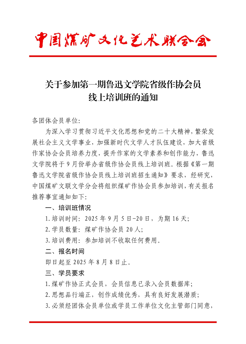 關(guān)于參加第一期魯迅文學(xué)院省級(jí)作協(xié)會(huì)員線上培訓(xùn)班的通知 來源:中國煤礦文聯(lián) 作者: 時(shí)間:2025-07-22 【字體:小 大】 ▲ 掃碼或點(diǎn)擊在線填寫魯迅文學(xué)院省級(jí)作協(xié)會(huì)員線上培訓(xùn)報(bào)名表 分享到: 【打印正文】