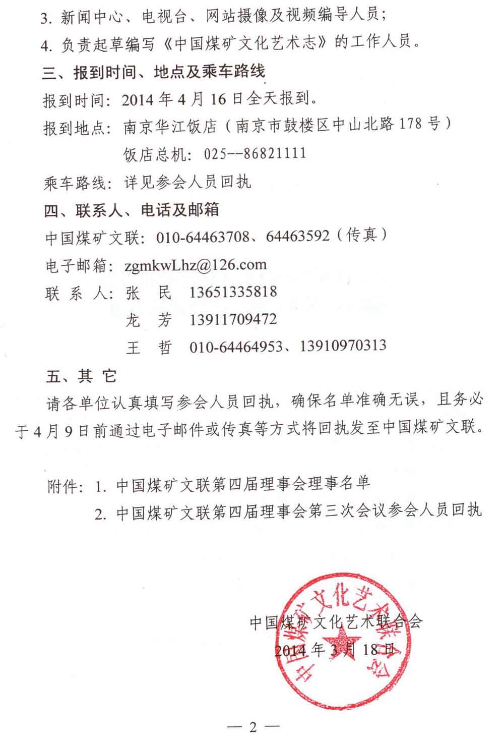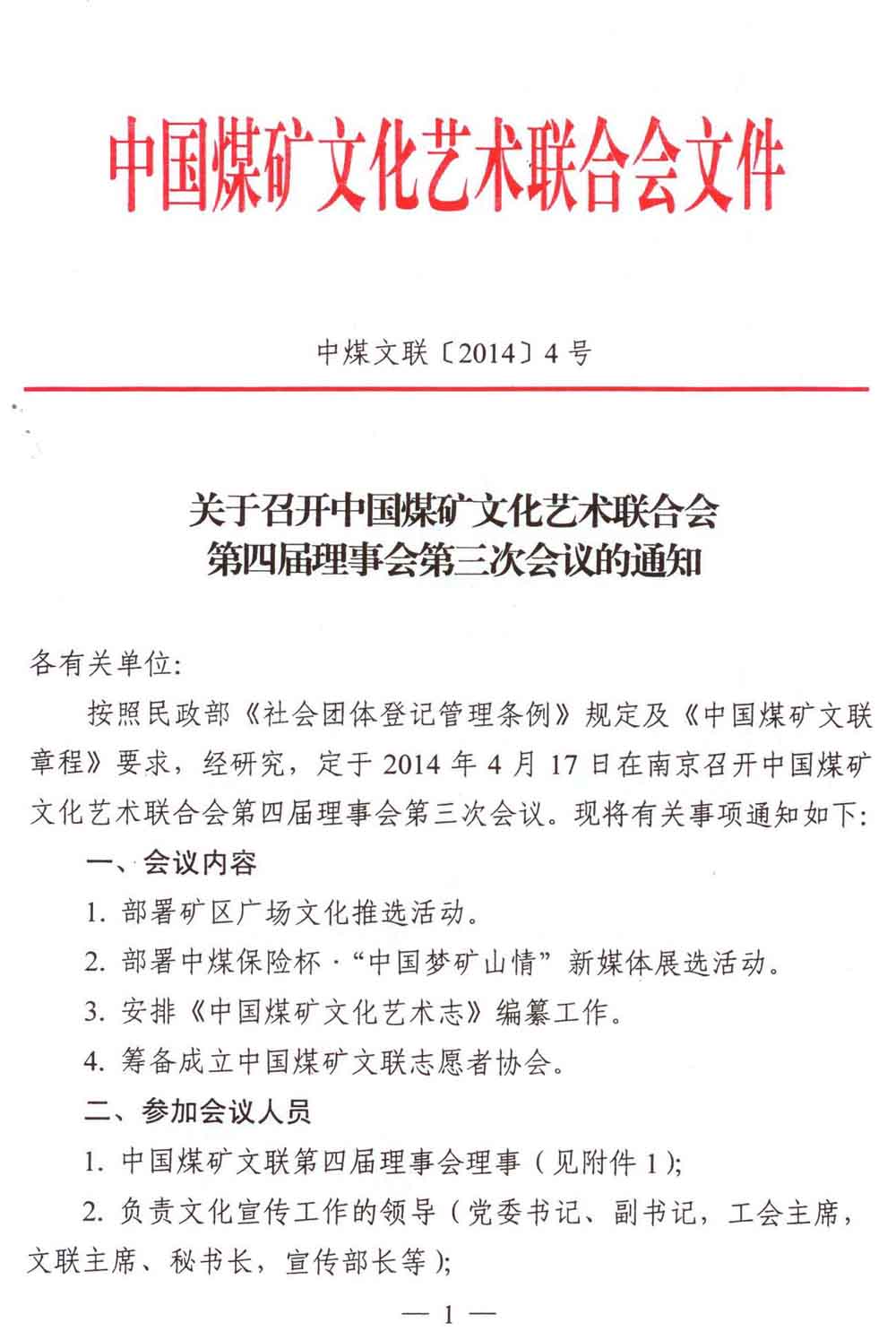 關于召開中國煤礦文聯第四屆理事會第三次會議的通知 來源:中國煤礦文化網 作者:煤礦文聯 時間:2014-03-24 【字體:小 大】 附件: 1.中國煤礦文聯第四屆理事會理事名單 2.中國煤礦文聯第四屆理事會第三次會議參會人員回執 3.中國煤礦文聯第四屆理事會理事登記表 分享到: 【打印正文】