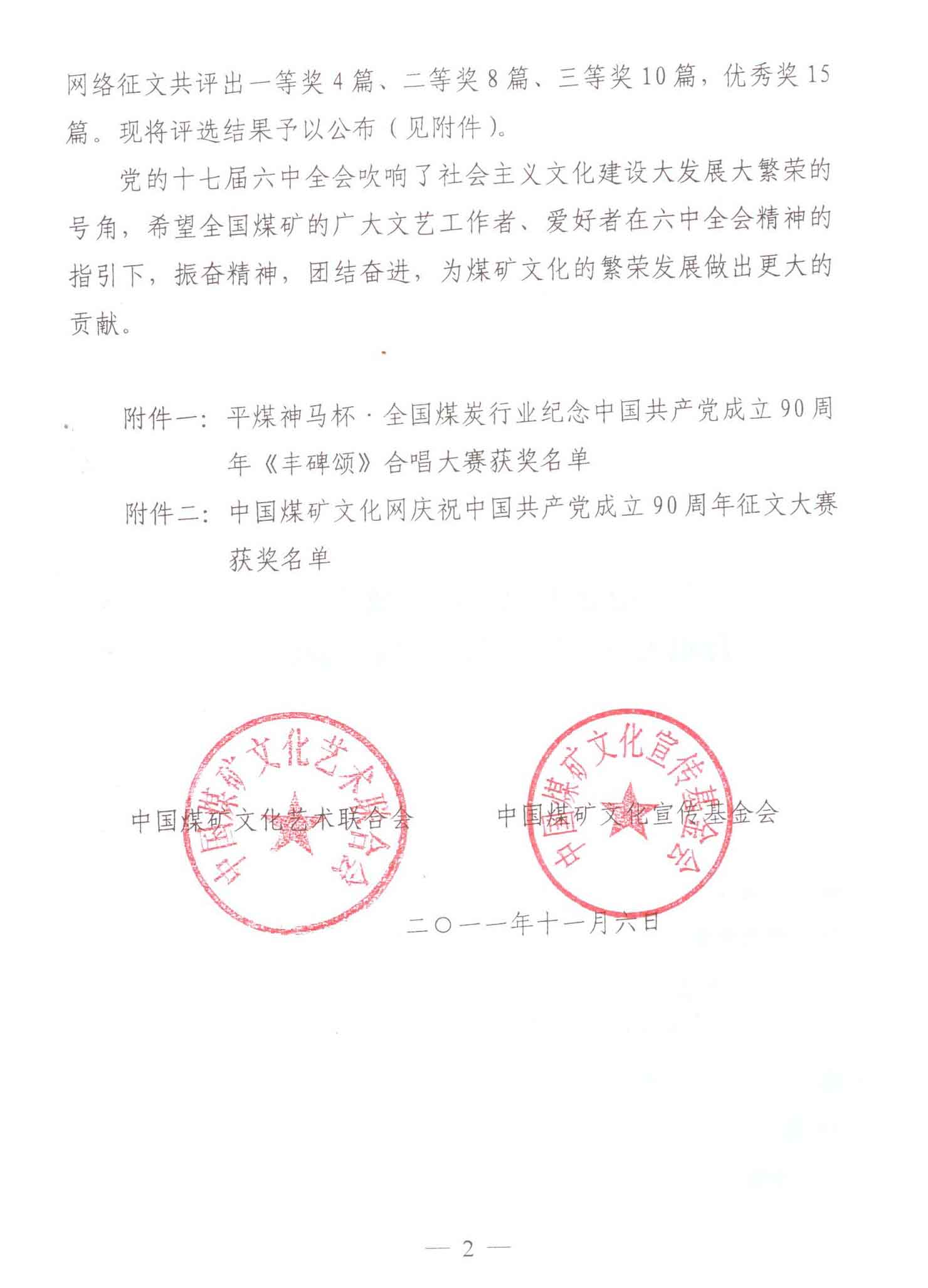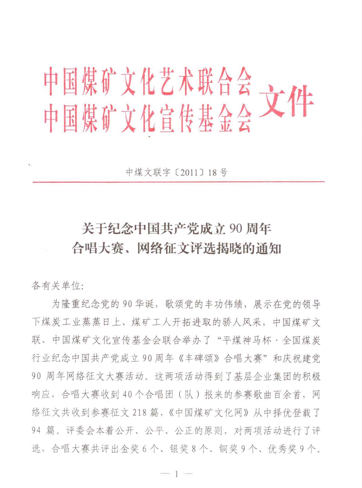 關于紀念中國共產黨成立90周年合唱大賽、網絡征文評選揭曉的通知 來源:中國煤礦文化網 作者:煤礦文聯 時間:2011-11-14 【字體:小 大】 附件1:平煤神馬杯全國煤炭行業紀念中國共產黨成立90周年《豐碑頌》合唱大賽獲獎名單 附件2:中國煤礦文化網慶祝中國共產黨成立90周年征文大賽獲獎名單 分享到: 【打印正文】