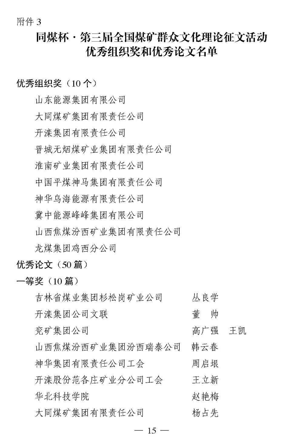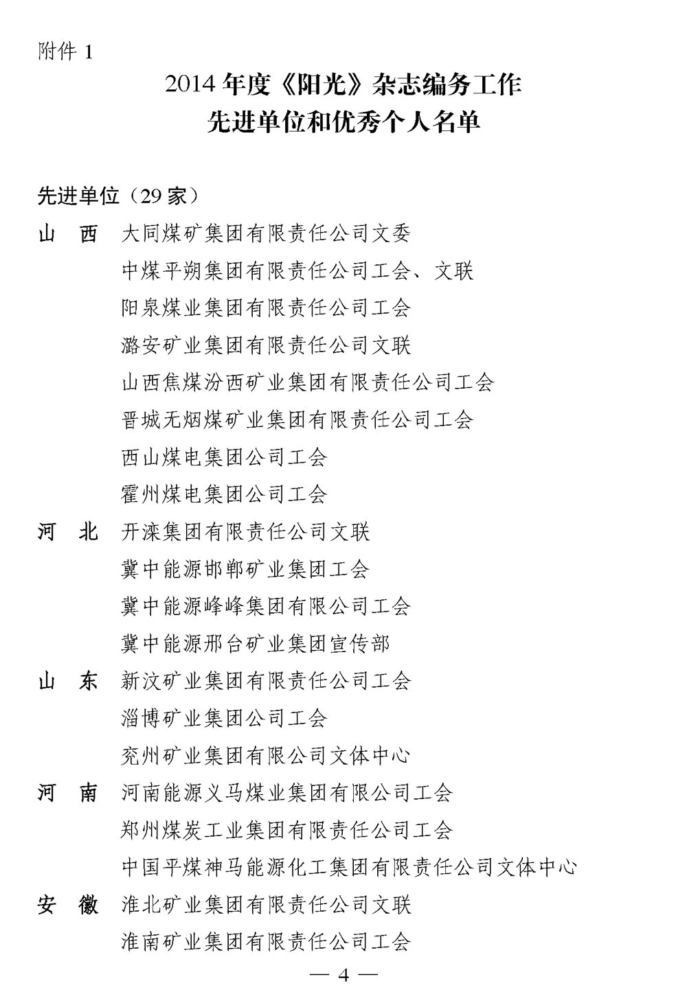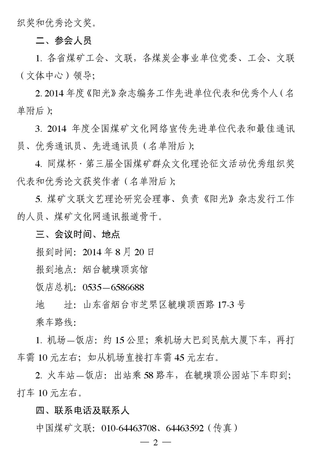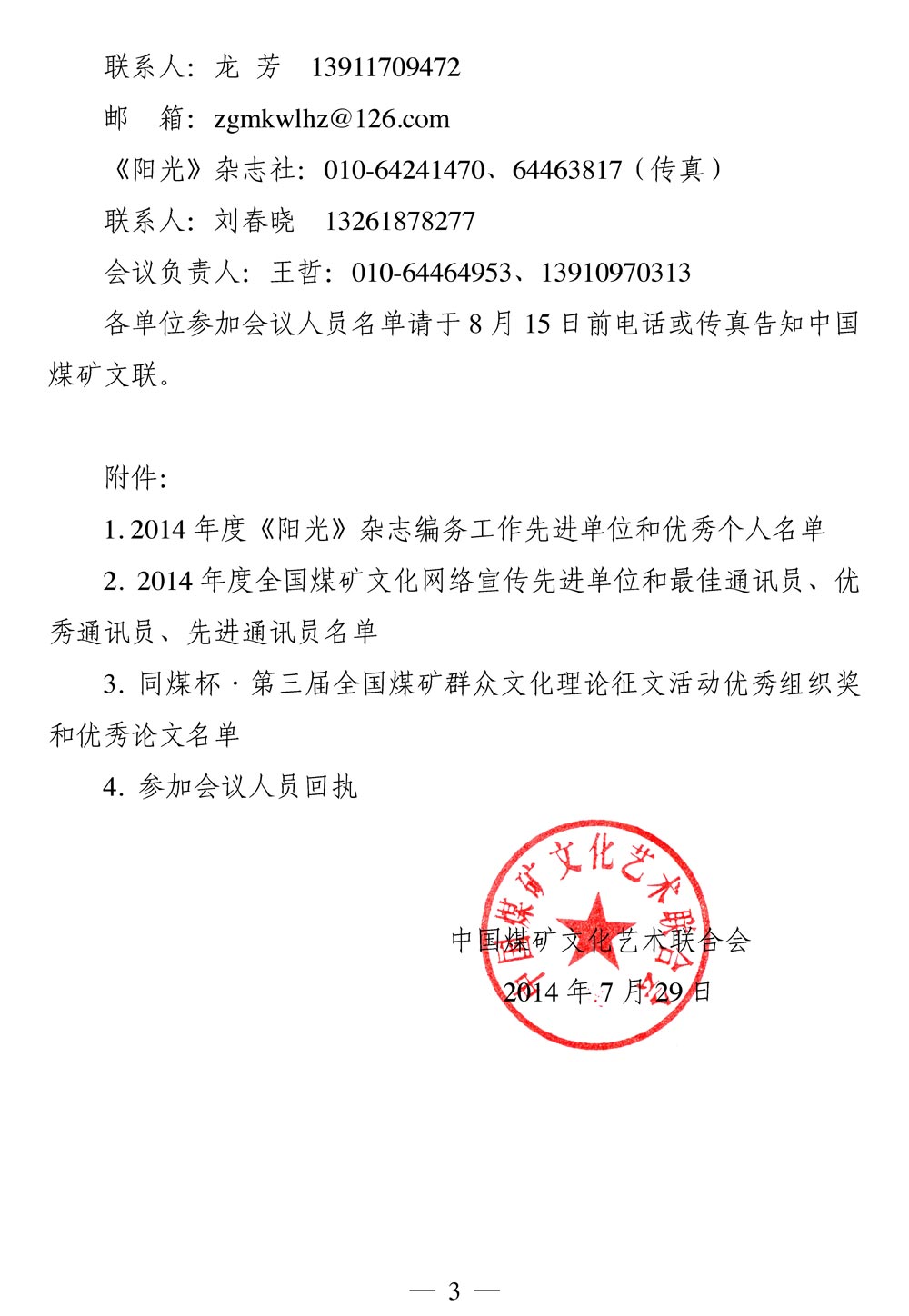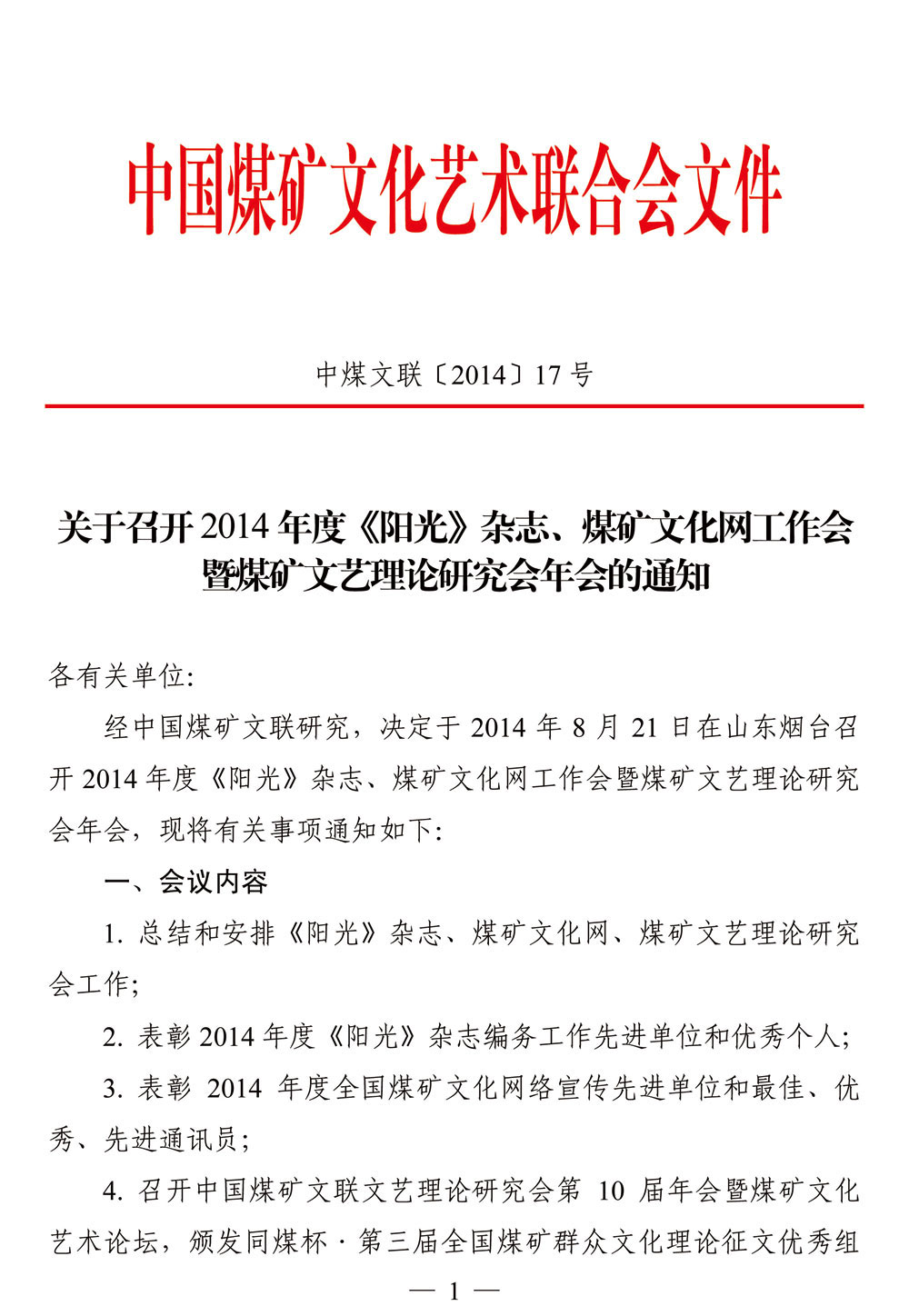 關(guān)于召開2014年度《陽光》雜志、煤礦文化網(wǎng)工作會(huì)暨煤礦文藝?yán)碚撗芯繒?huì)年會(huì)的通知 來源:中國煤礦文聯(lián) 作者: 時(shí)間:2014-07-31 【字體:小 大】 附件: 1. 2014年度《陽光》雜志編務(wù)工作先進(jìn)單位和優(yōu)秀個(gè)人名單 2. 2014年度全國煤礦文化網(wǎng)絡(luò)宣傳先進(jìn)單位和最佳通訊員、優(yōu)秀通訊員、先進(jìn)通訊員名單 3. 同煤杯·第三屆全國煤礦群眾文化理論征文活動(dòng)優(yōu)秀組織獎(jiǎng)和優(yōu)秀論文名單 4. 參加會(huì)議人員回執(zhí) 分享到: 【打印正文】