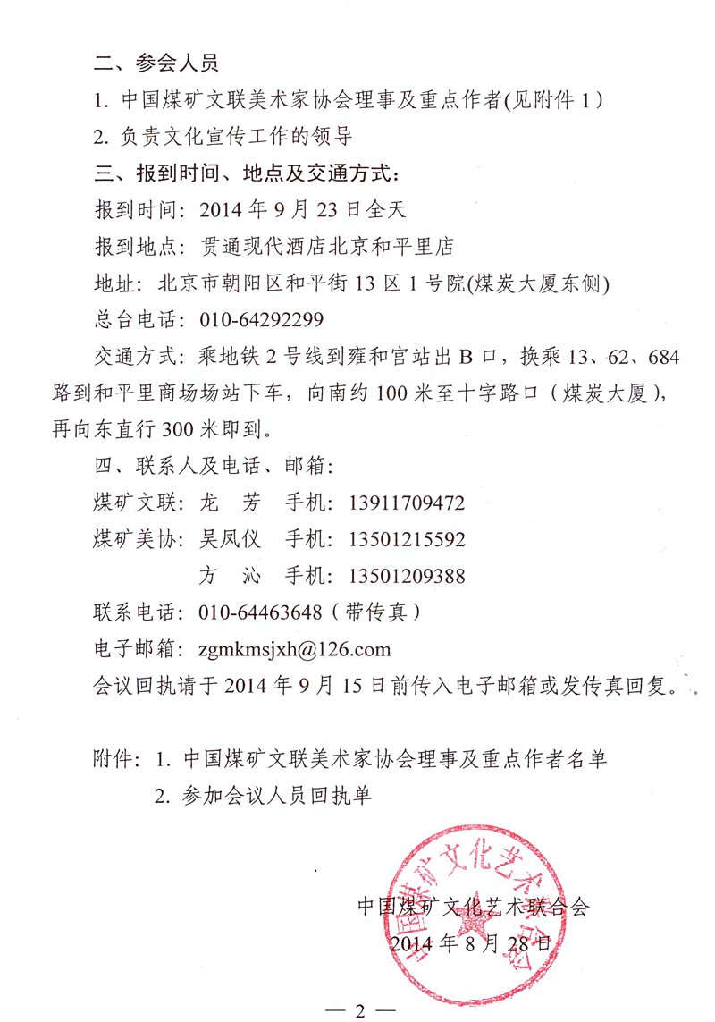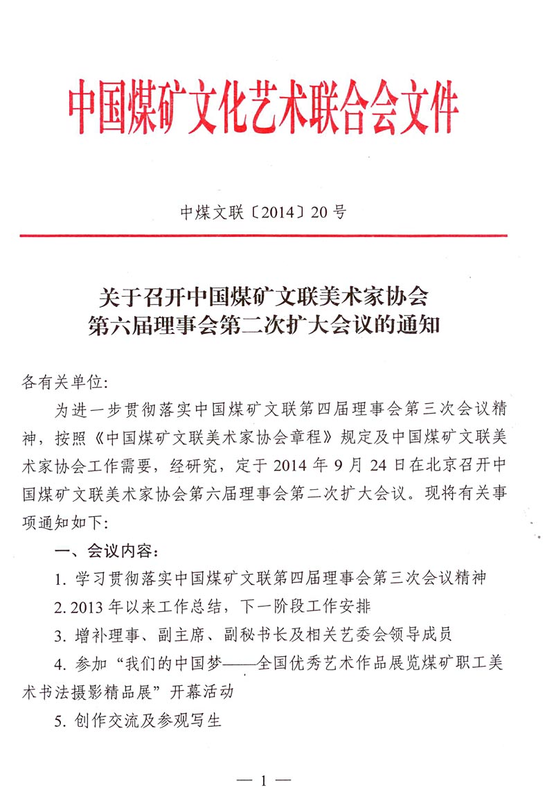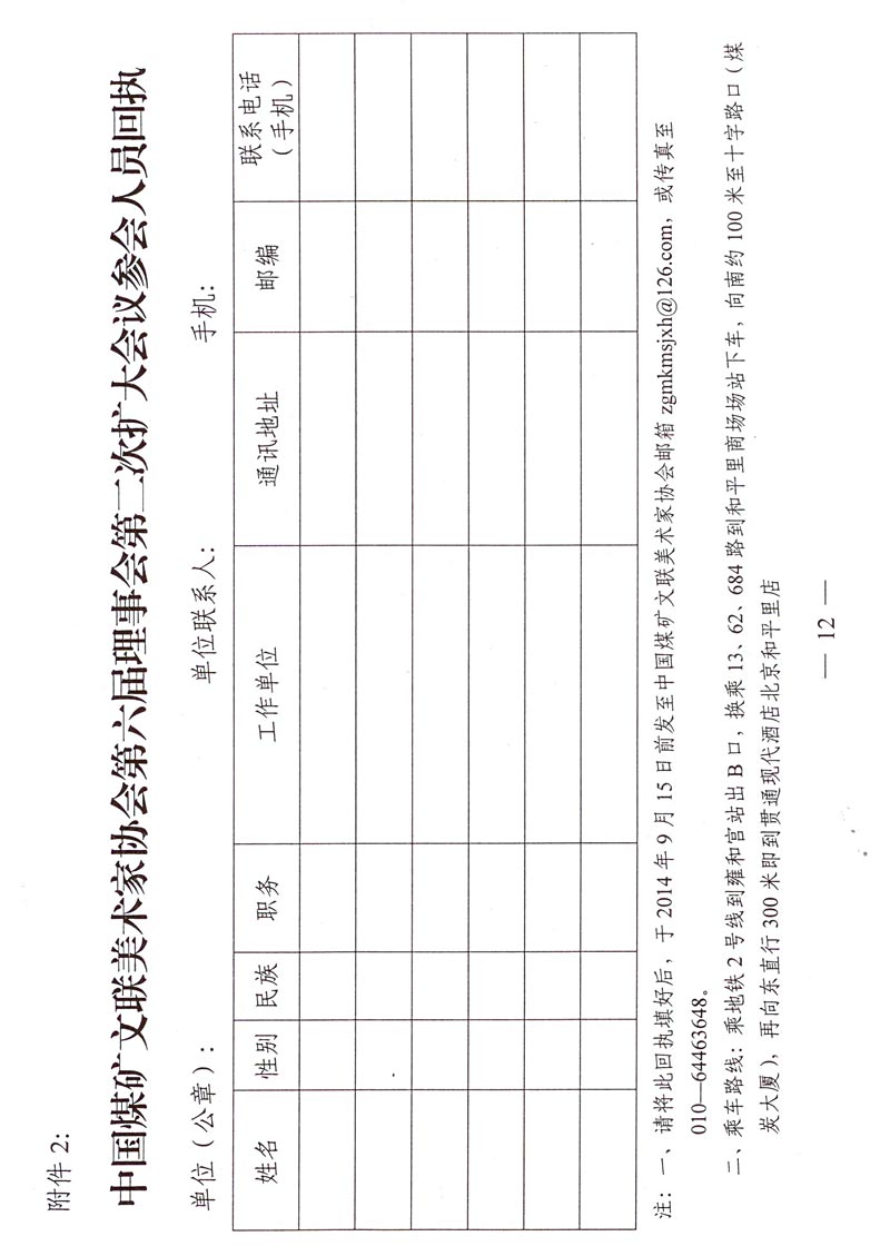 關于召開中國煤礦文聯美術家協會第六屆理事會第二次擴大會議的通知 來源:中國煤礦文聯 作者: 時間:2014-08-29 【字體:小 大】 附件:1. 中國煤礦文聯美術家協會理事及重點作者名單 2. 參加會議人員回執 分享到: 【打印正文】